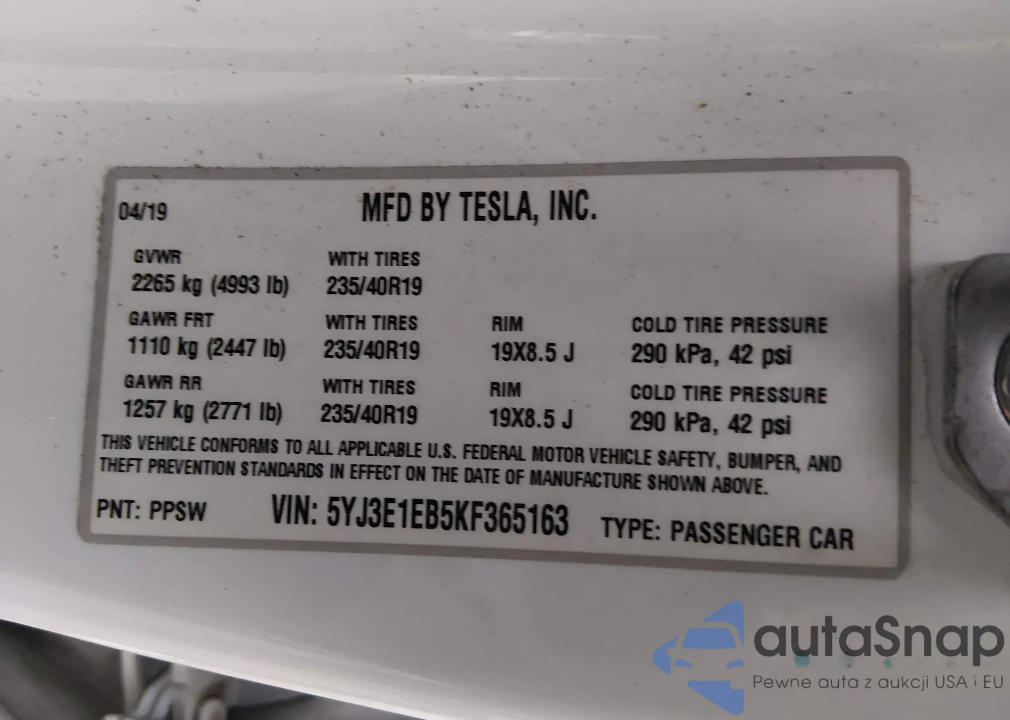 Автомобиль Tesla Model 3 2019 (VIN 5YJ3E1EB5KF365163) имеет документы, препятствующие регистрации. Могут возникнуть сложности при экспорте и регистрации. Обратитесь к экспертам AutaSnap для поиска альтернатив.