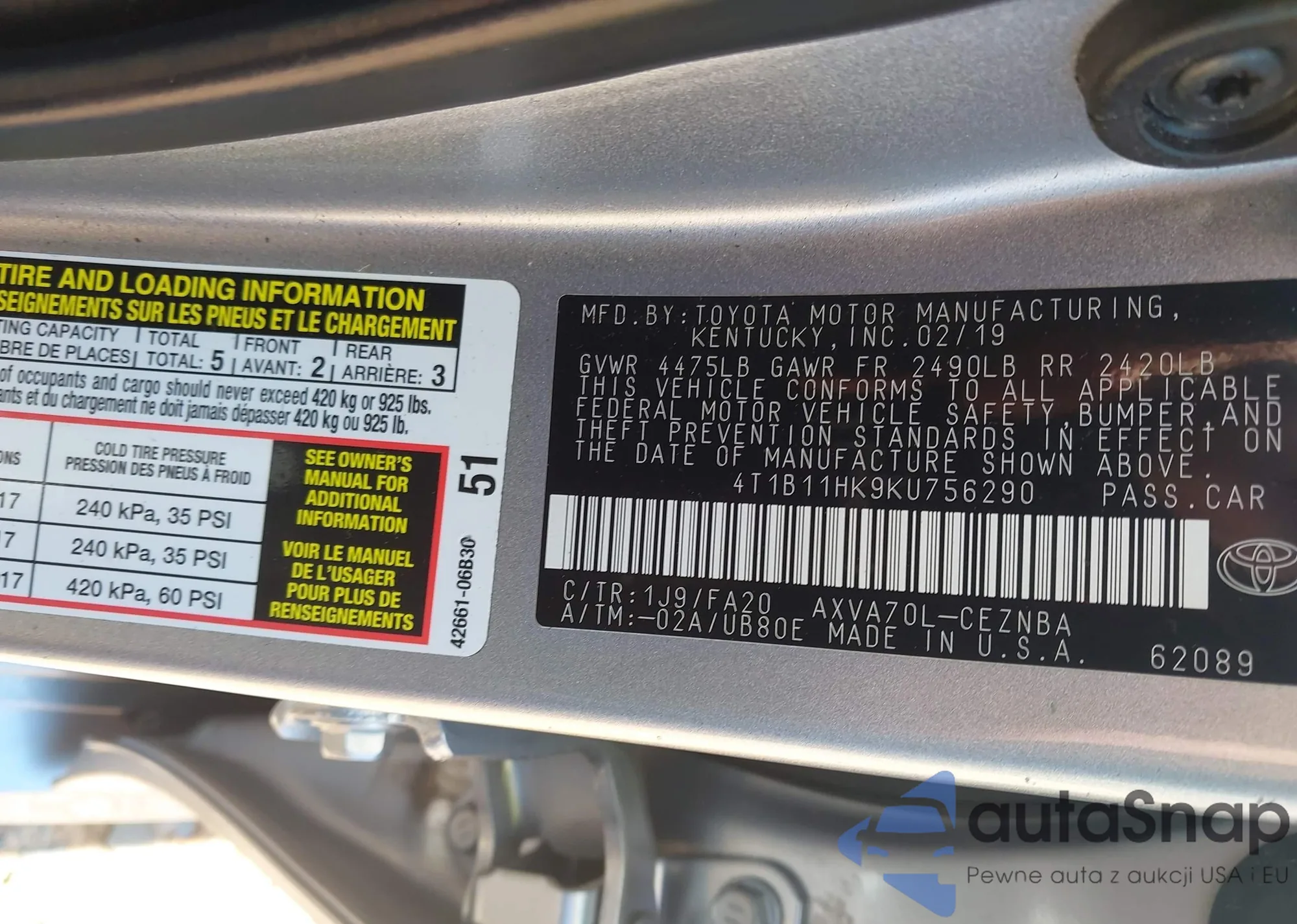 VIN: 4T1B11HK9KU756290