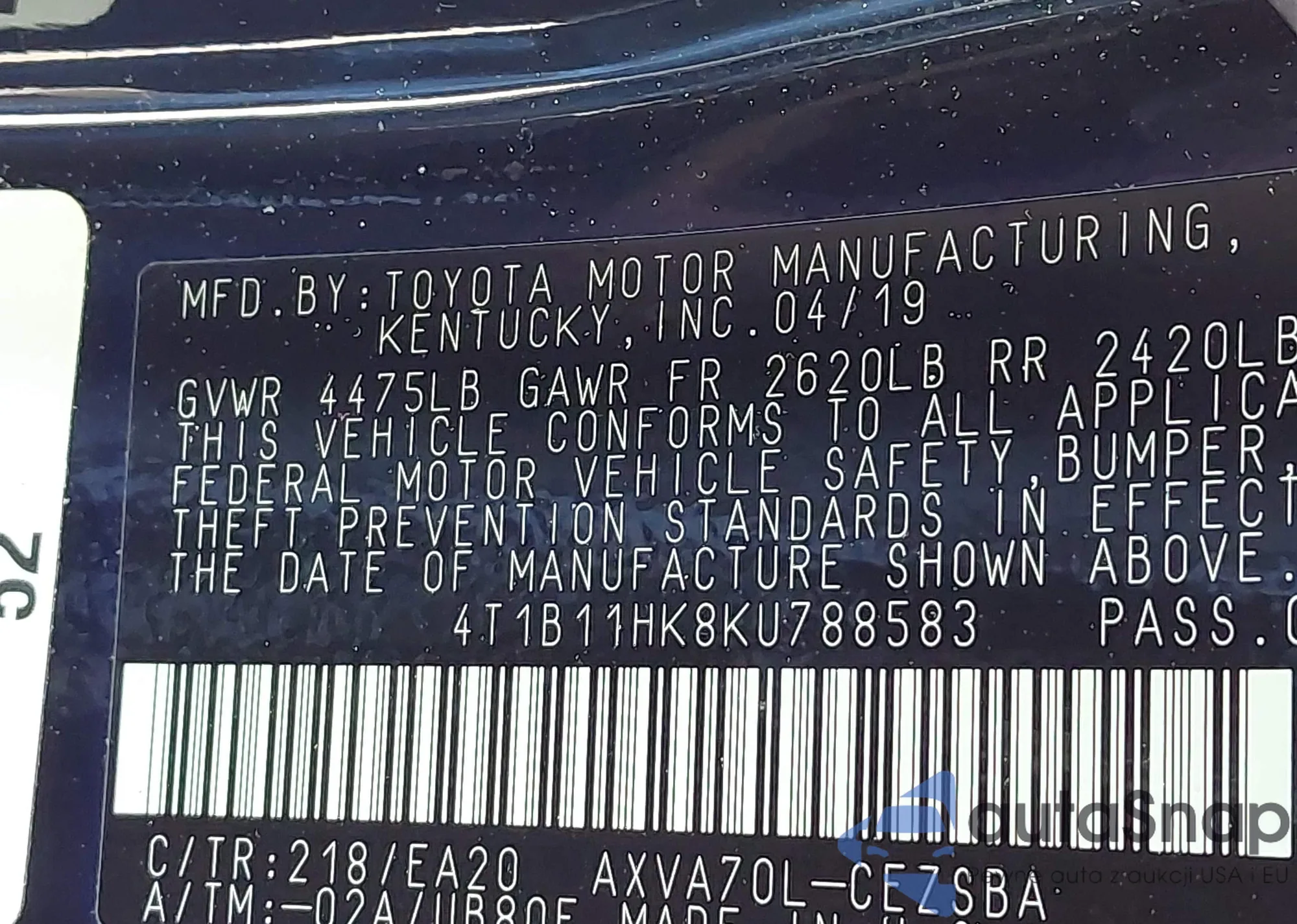 VIN: 4T1B11HK8KU7885