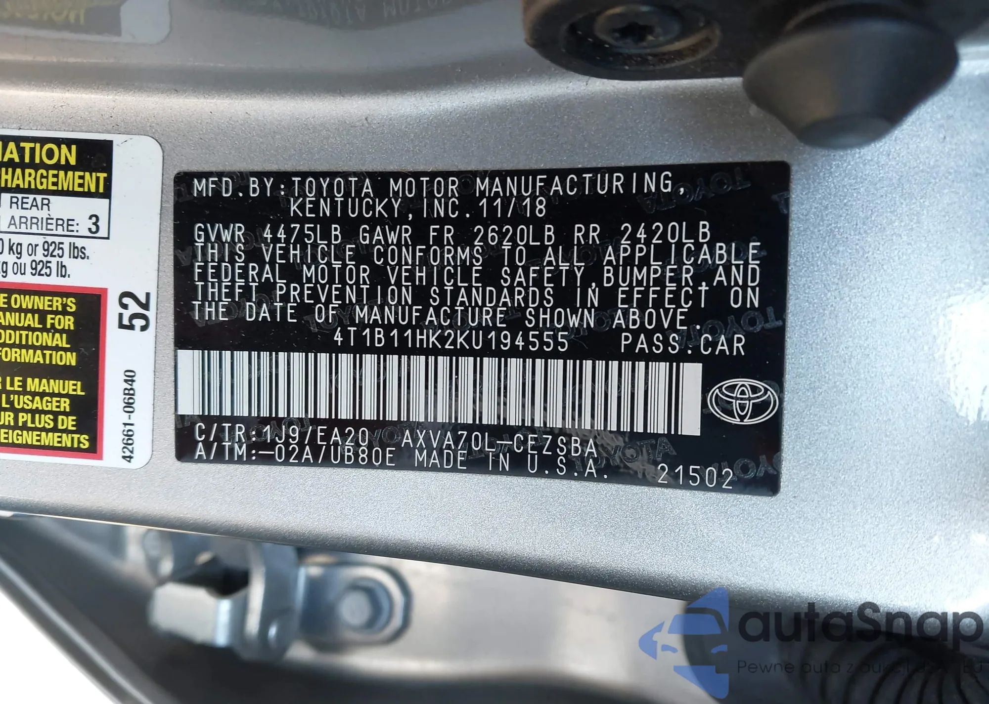 VIN: 4T1B11HK2KU194555