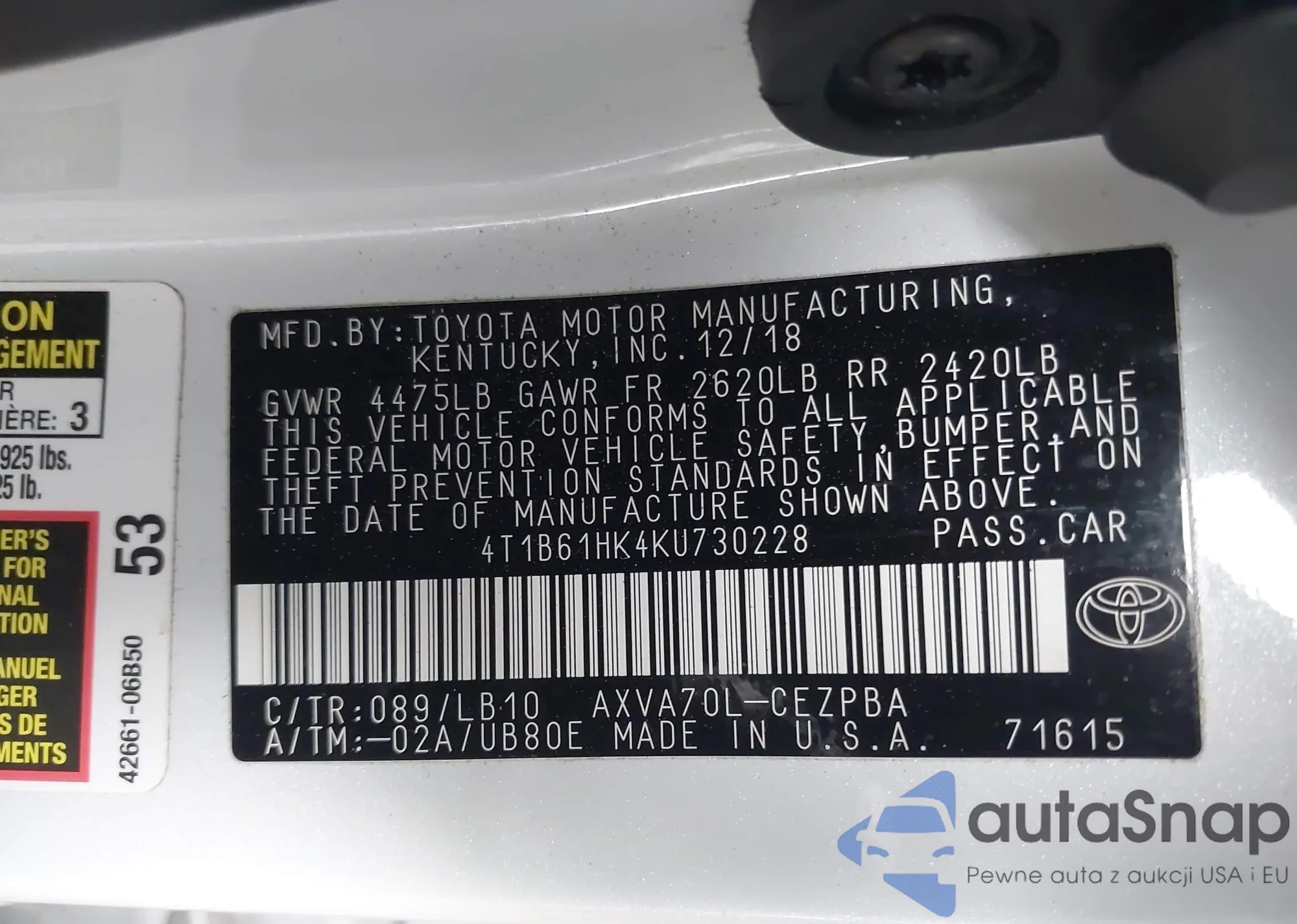 VIN: 4T1B61HK4KU730228