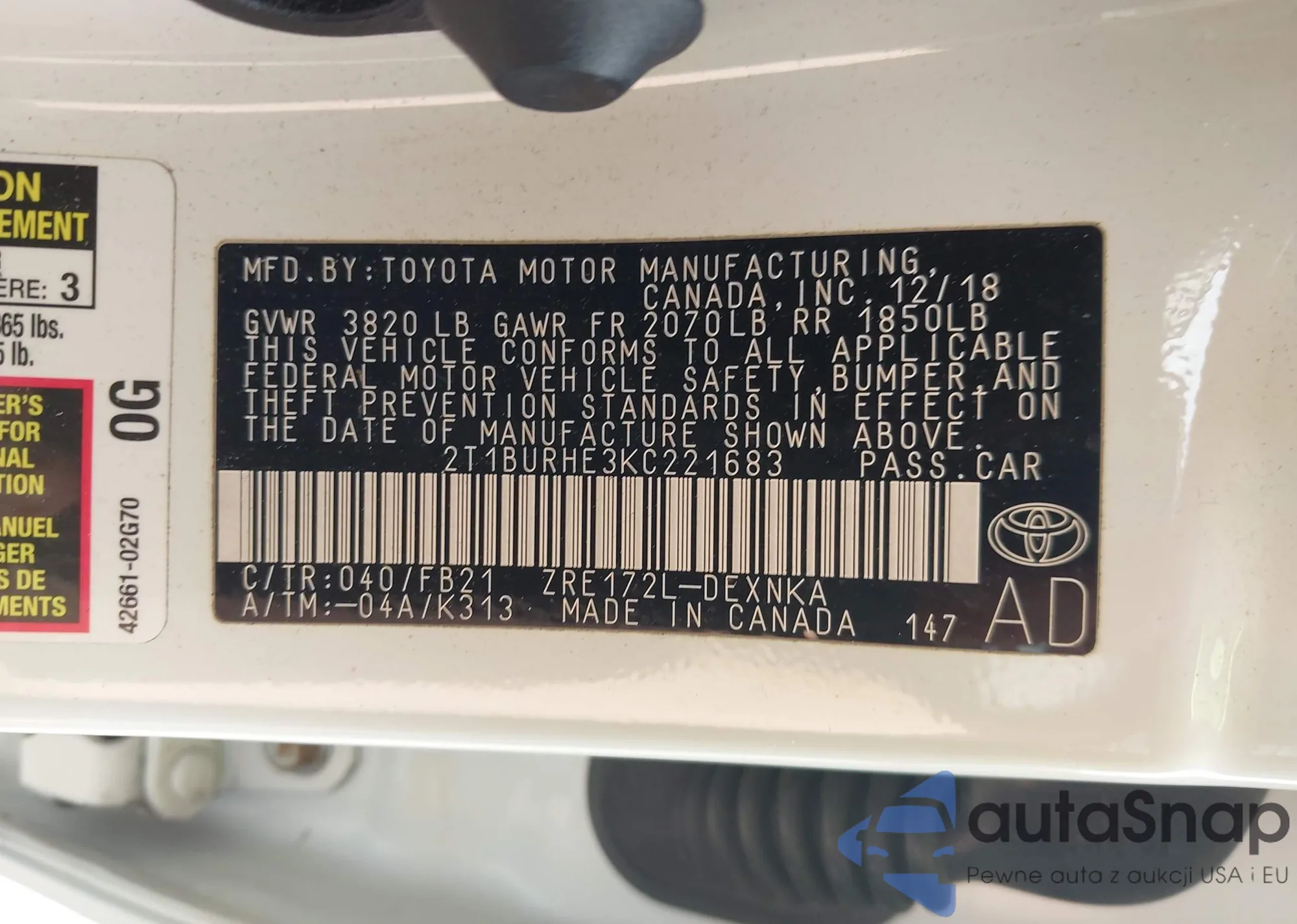 VIN: 2T1BURHE3KC221683