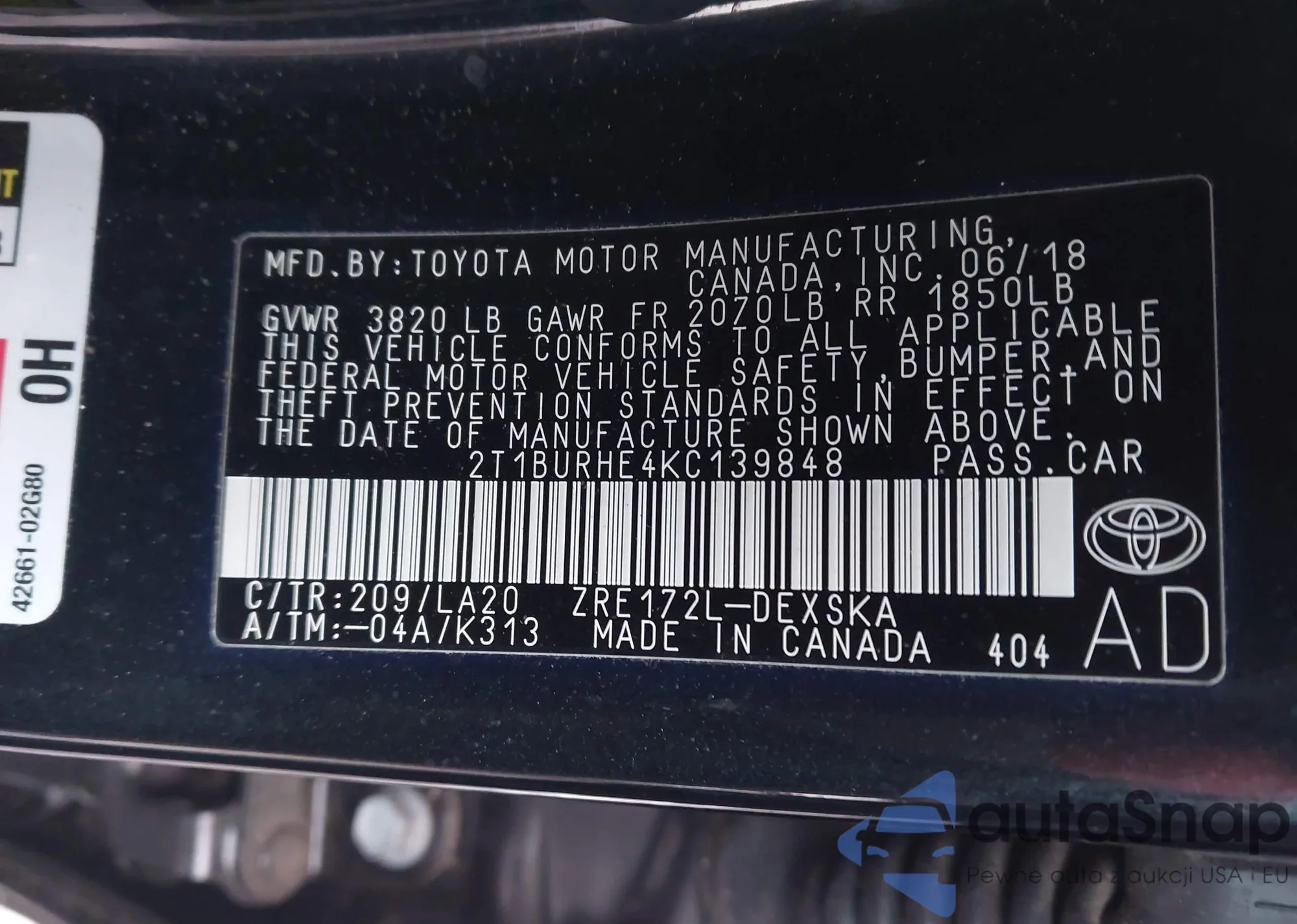 VIN: 2T1BURHE4KC139848