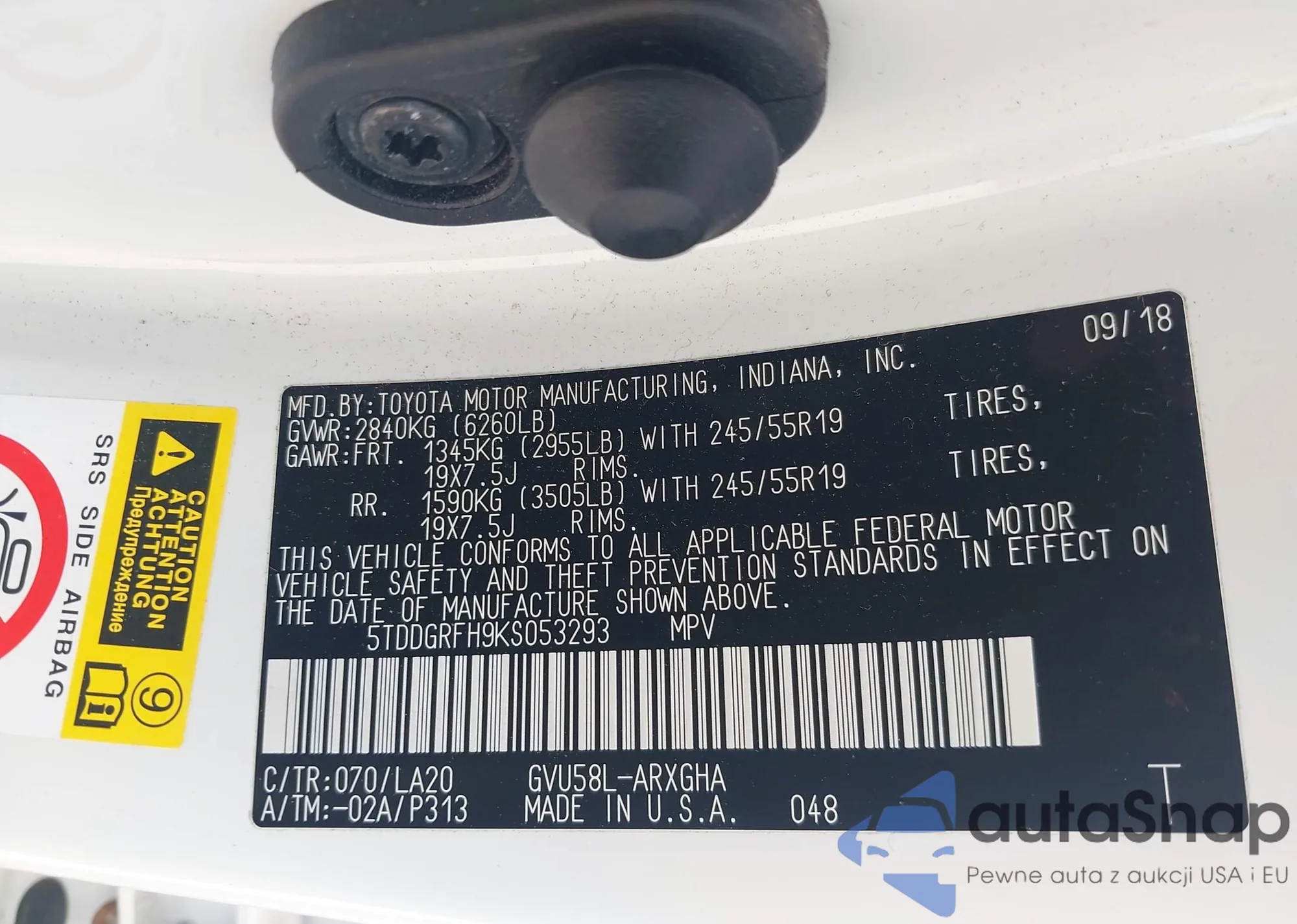 VIN: 5TDDGRFH9KS053293