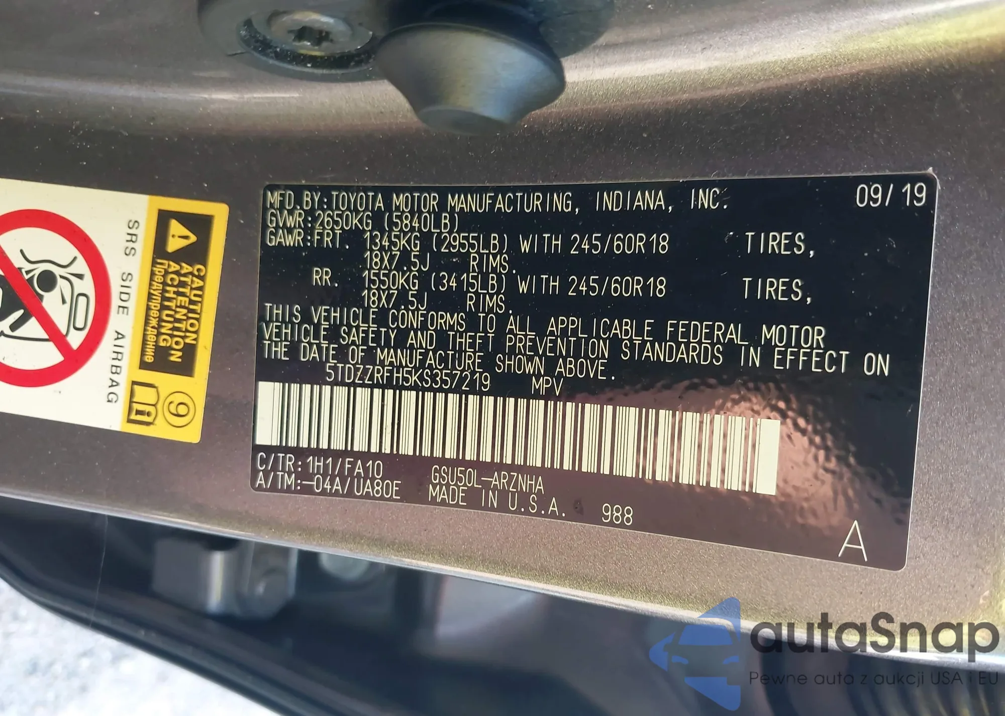 VIN: 5TDZZRFH5KS357219