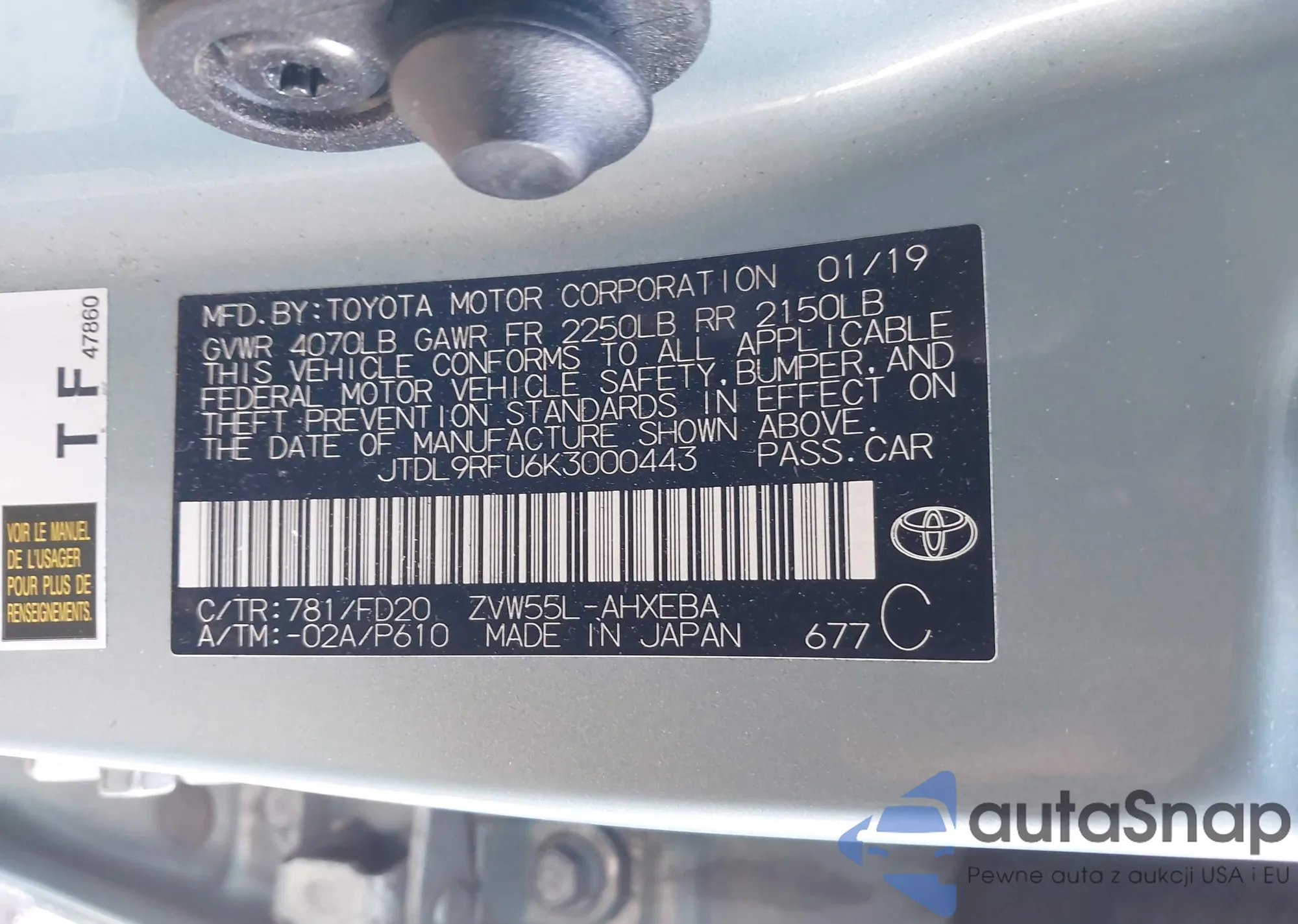 Автомобиль Toyota Prius 2019 (VIN JTDL9RFU6K3000443) ранее не участвовал в торгах. Документы чистые, пробег соответствует или ниже среднего по рынку. Продаётся страховой компанией — рекомендуем покупку. Доставка в порт займет около 6–8 недель.