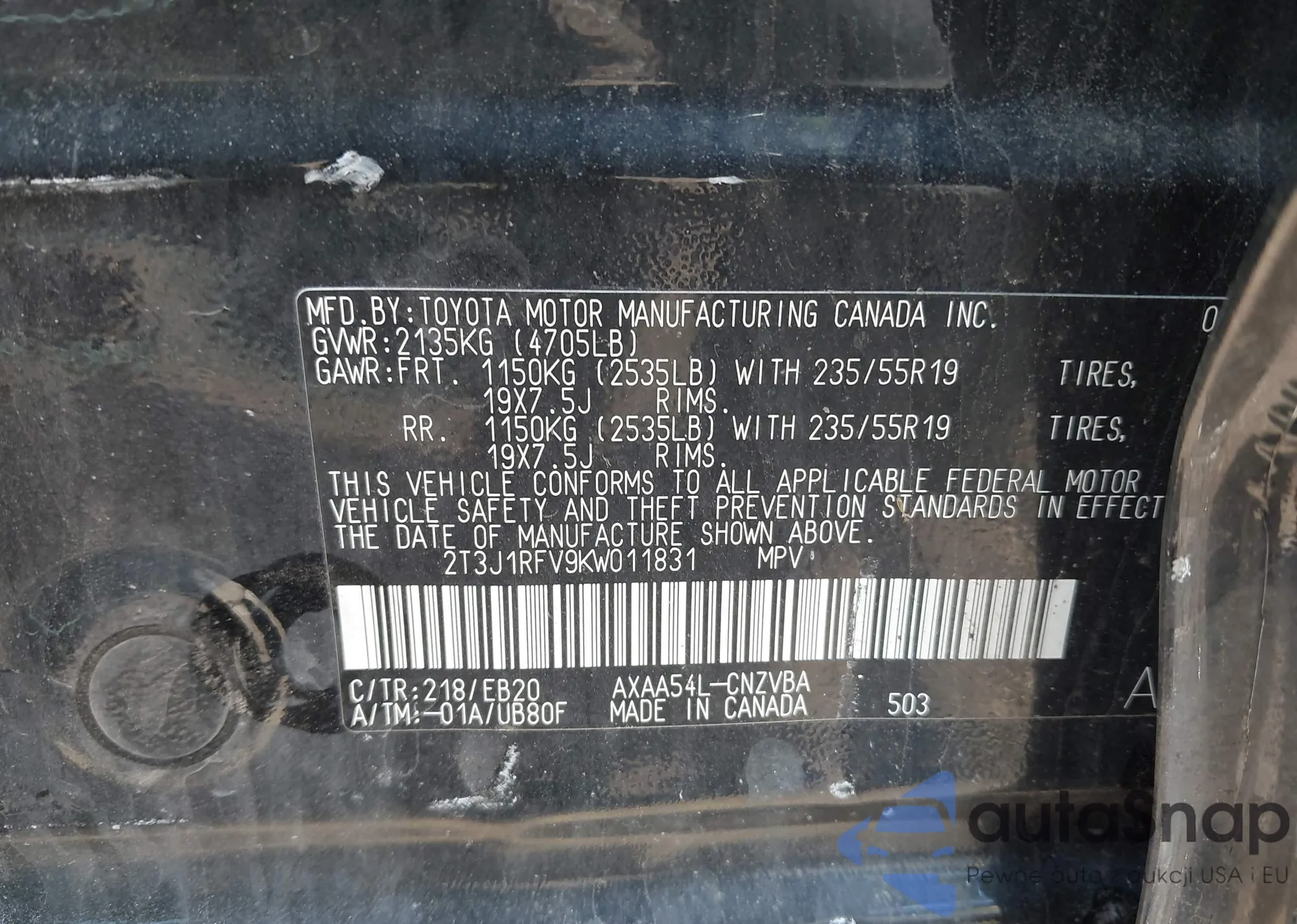 VIN: 2T3J1RFV9KW011831