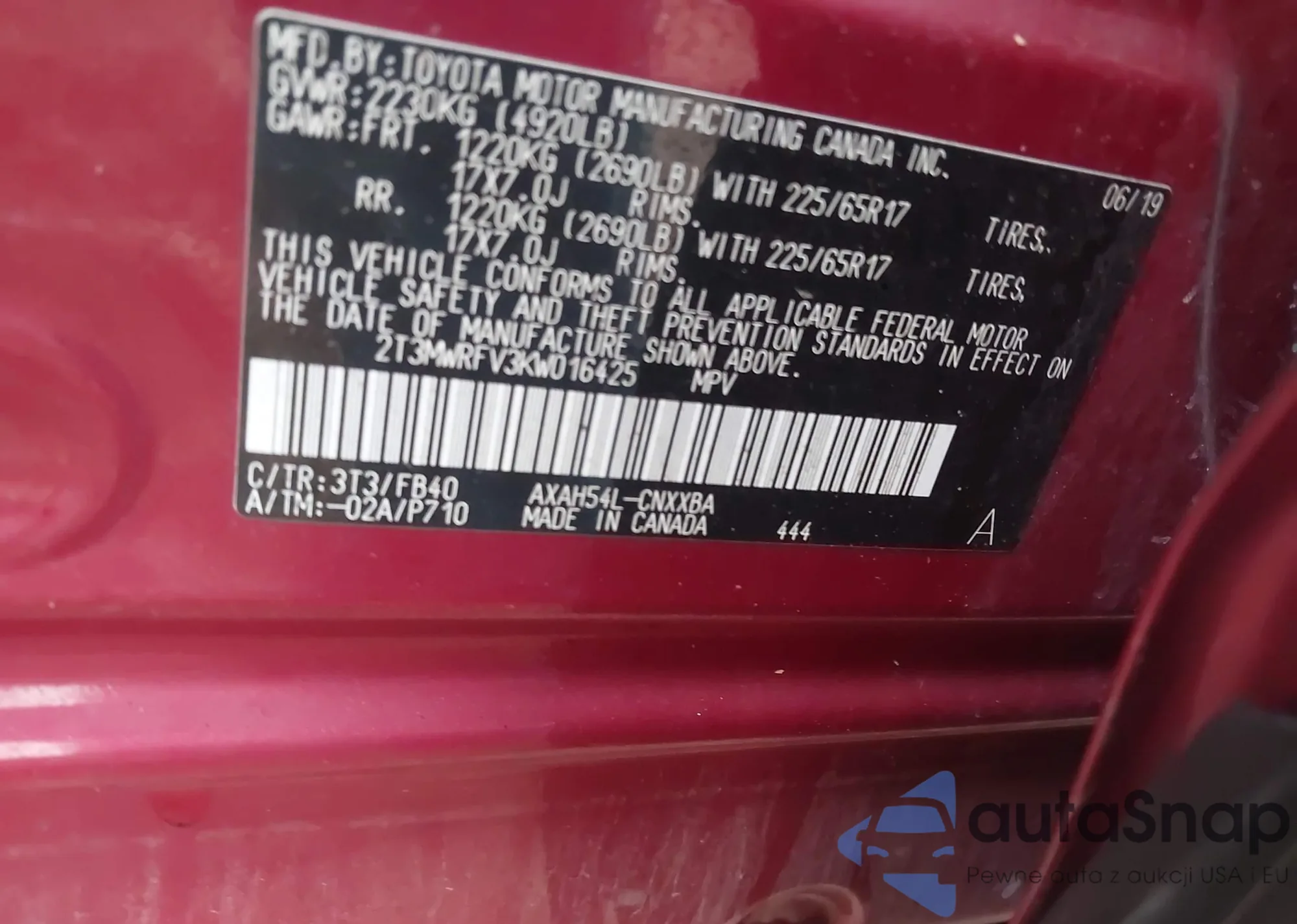 Автомобиль Toyota RAV 4 2019 (VIN 2T3MWRFV3KW016425) ранее не участвовал в торгах. Документы чистые, пробег соответствует или ниже среднего по рынку. Продаётся страховой компанией — рекомендуем покупку. Доставка в порт займет около 6–8 недель.