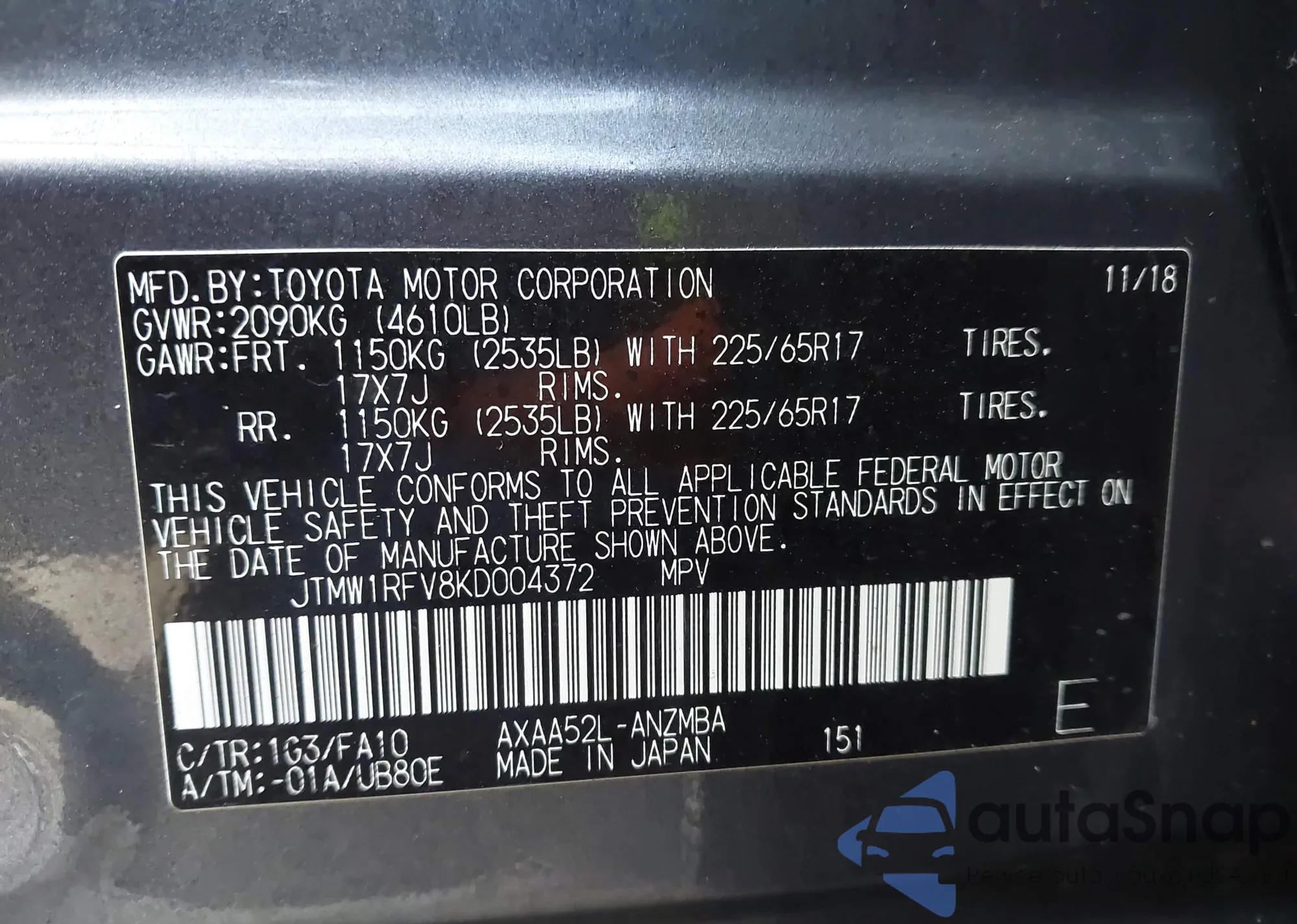 Автомобиль Toyota RAV 4 2019 (VIN JTMW1RFV8KD004372) ранее не участвовал в торгах. Документы чистые, пробег соответствует или ниже среднего по рынку. Продаётся страховой компанией — рекомендуем покупку. Доставка в порт займет около 6–8 недель.