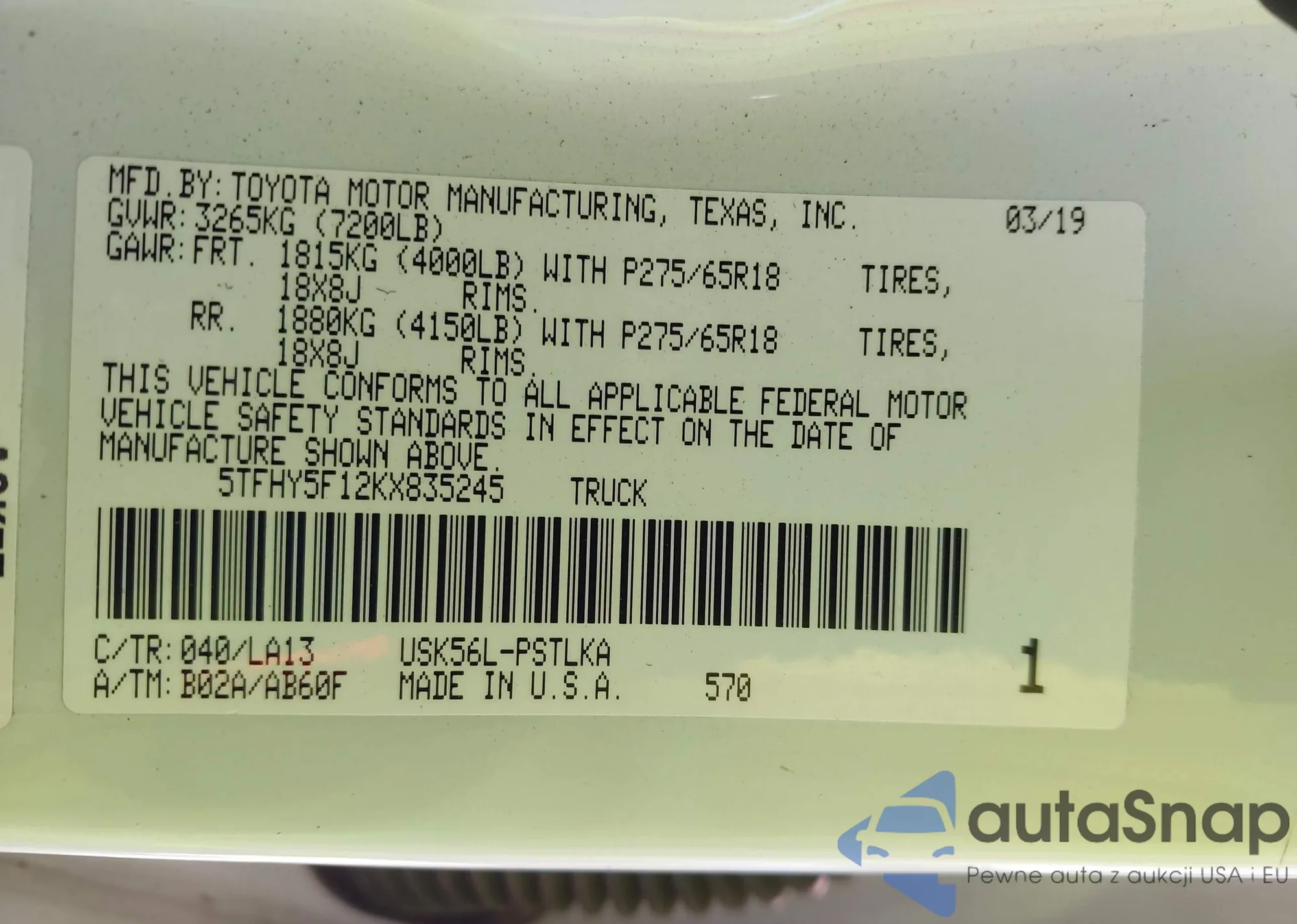 VIN: 5TFHY5F12KX835245