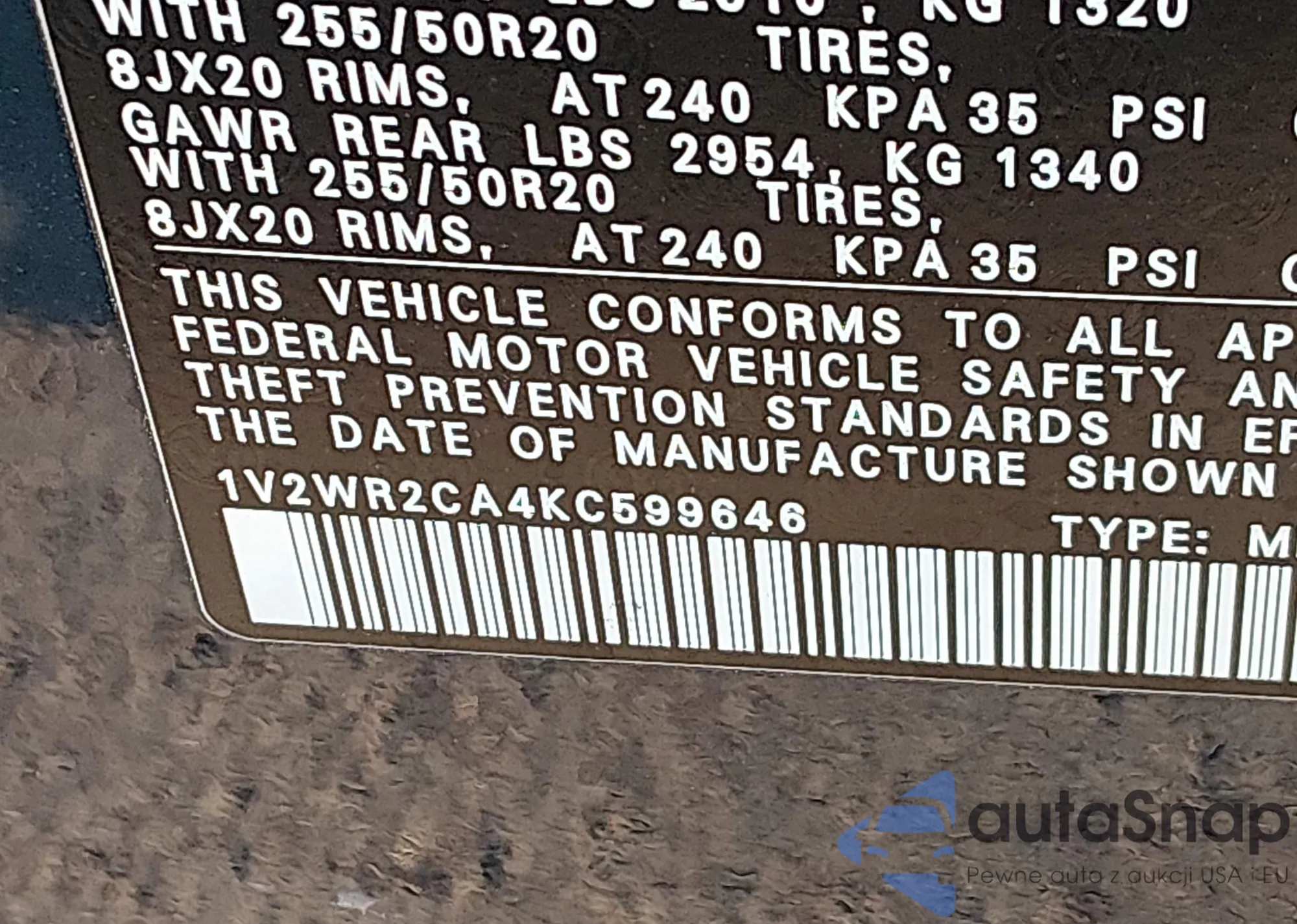 • VIN: 1V2WR2CA4KC599646