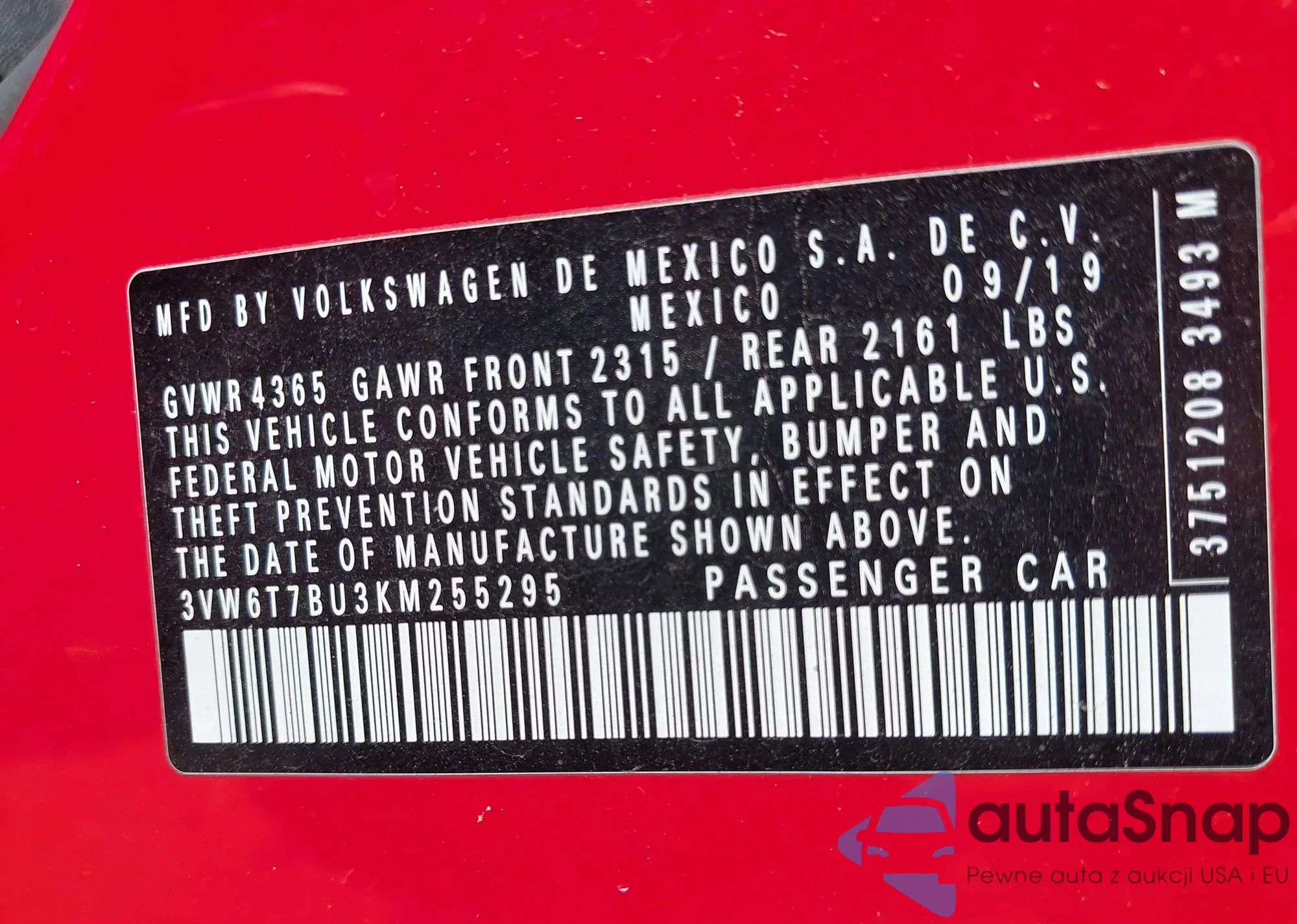 VIN: 3VW6T7BU3KM255295