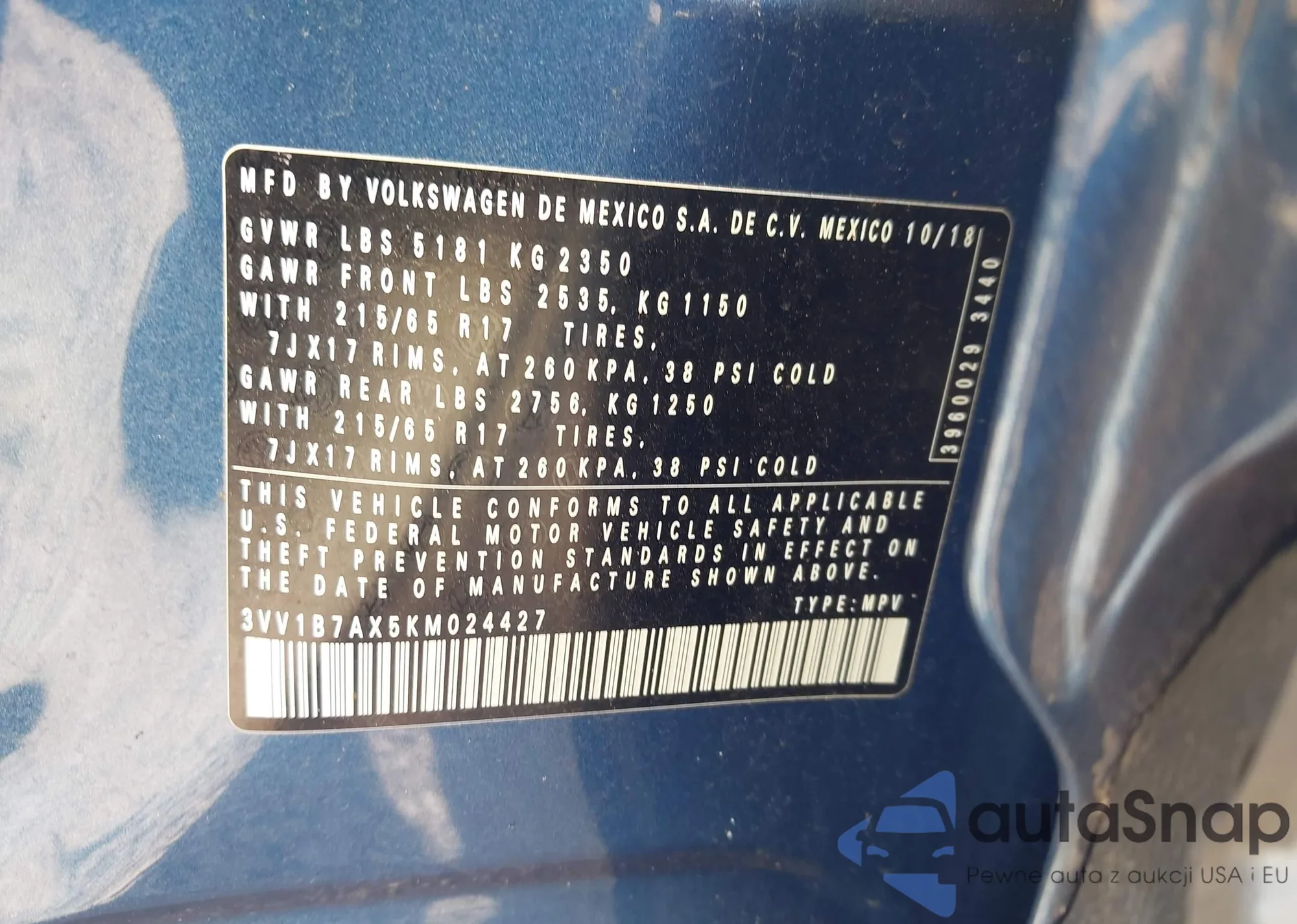 Автомобиль Volkswagen Tiguan 2019 (VIN 3VV1B7AX5KM024427) ранее не участвовал в торгах. Документы чистые, пробег соответствует или ниже среднего по рынку. Продаётся страховой компанией — рекомендуем покупку. Доставка в порт займет около 6–8 недель.