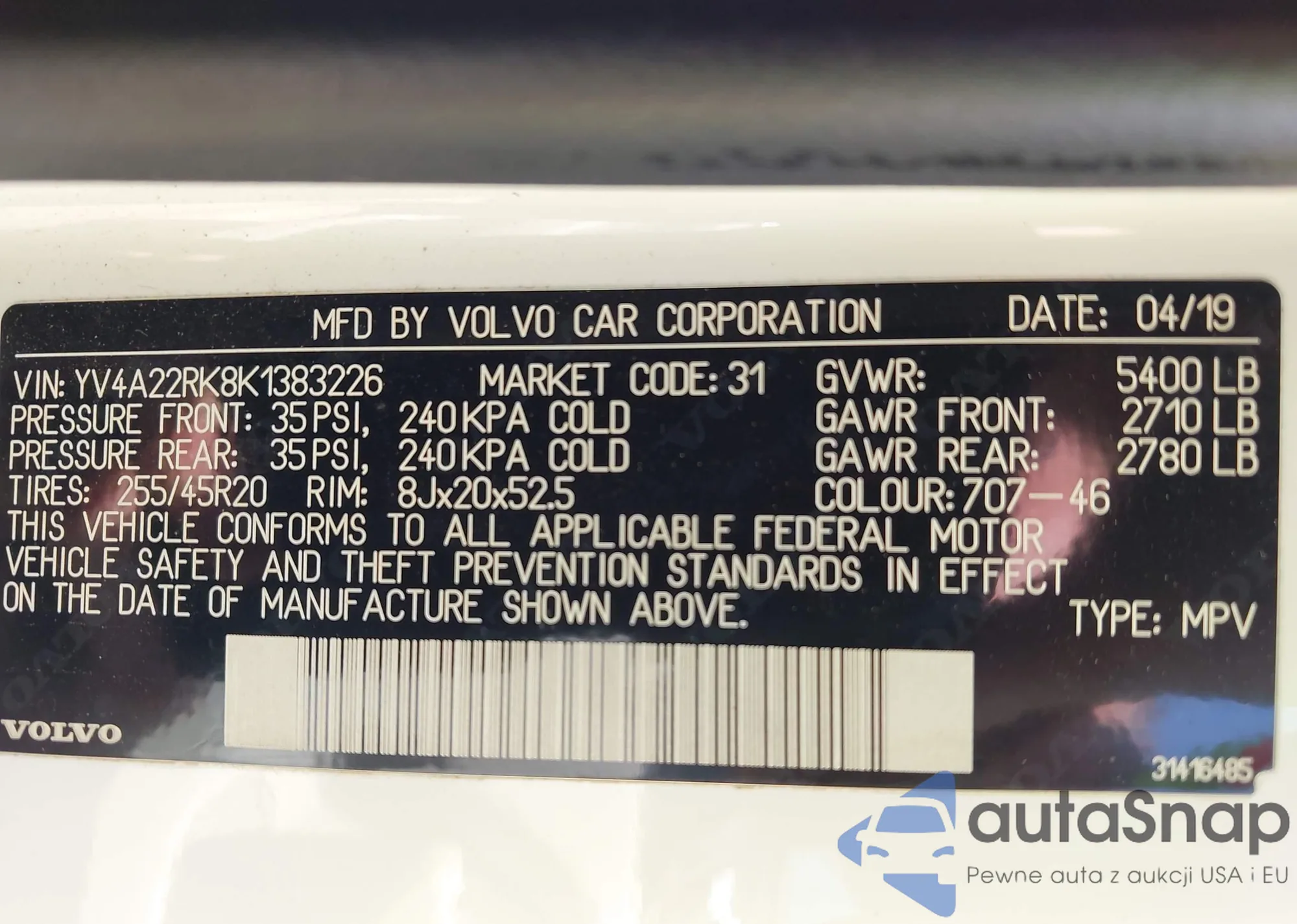 • VIN: YV4A22RK8K1383226