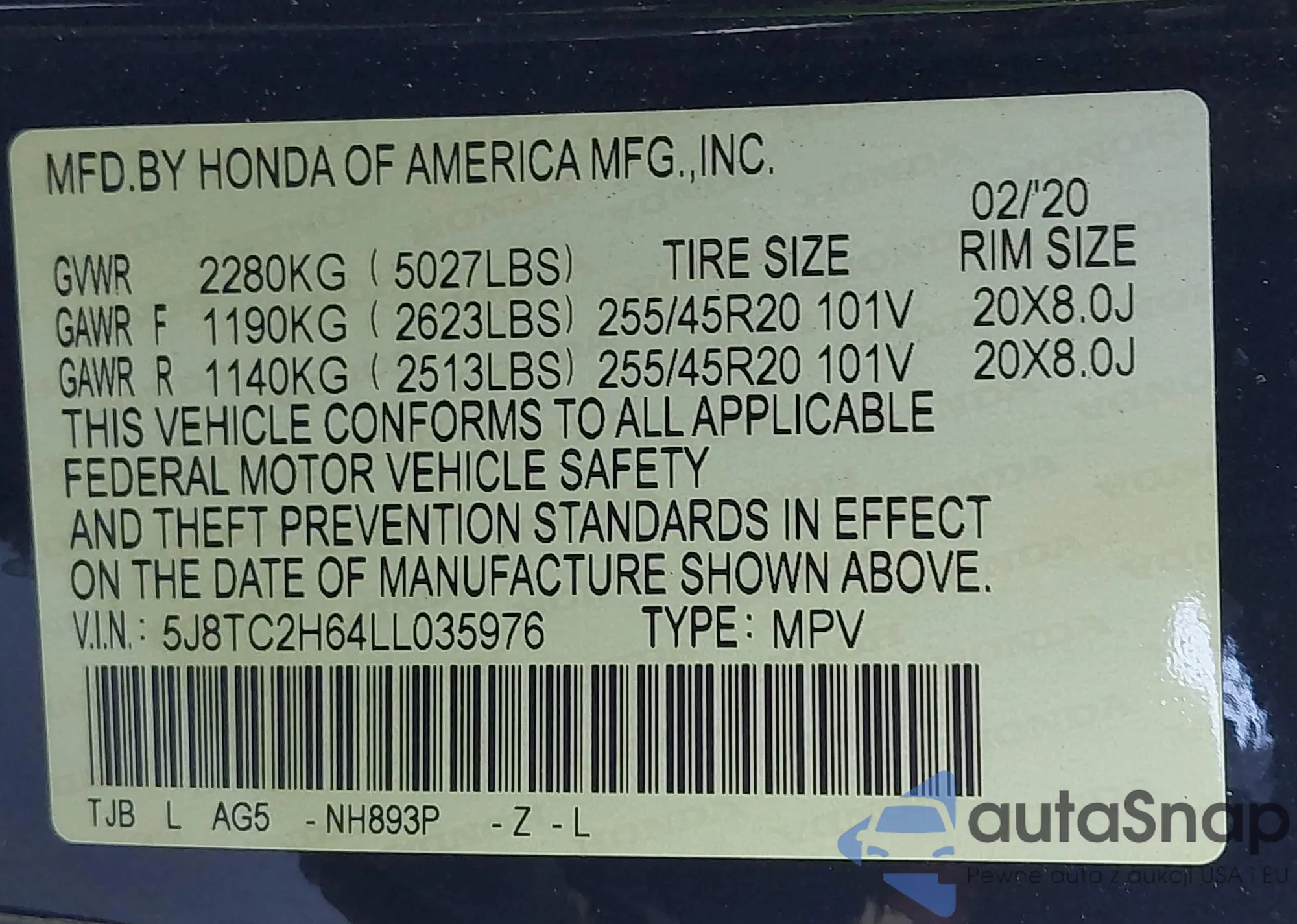 • VIN: 5J8TC2H64LL035976