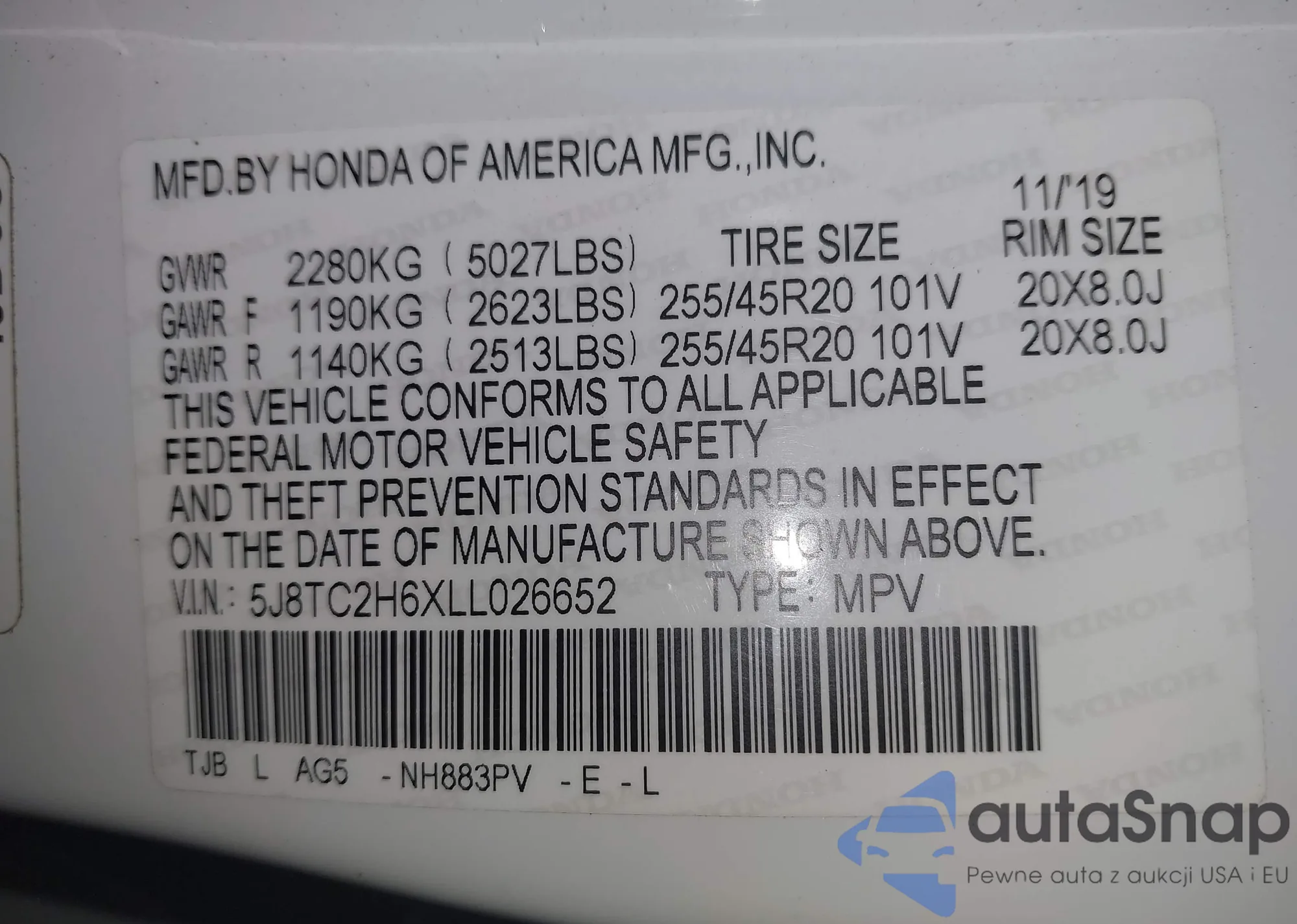 VIN: 5J8TC2H6XLL026652