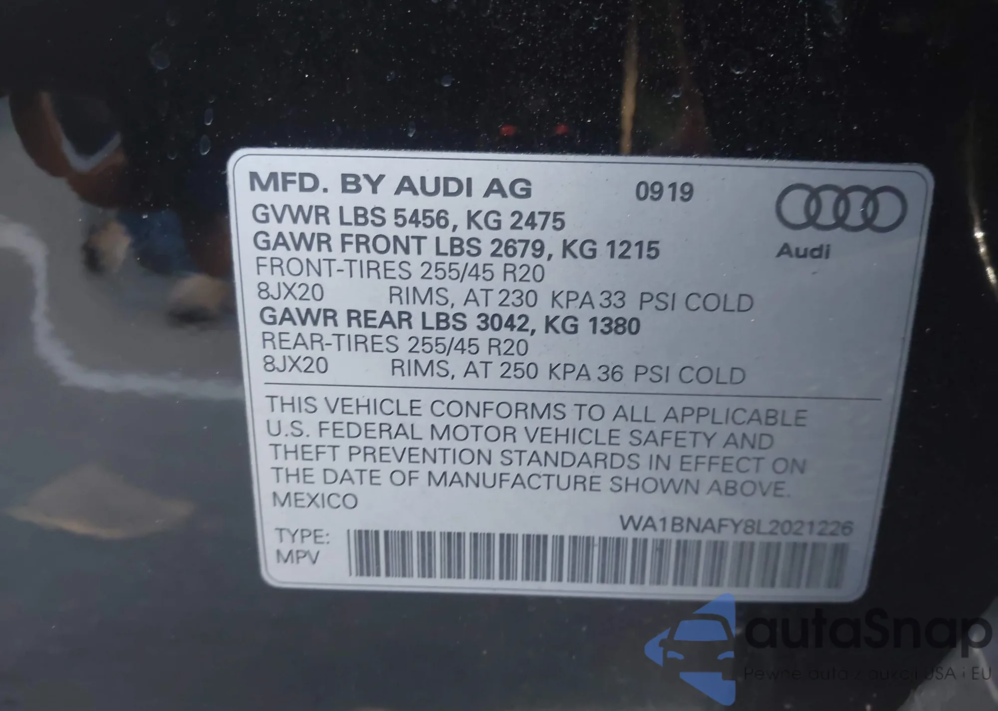 Автомобиль Audi Q5 2020 (VIN WA1BNAFY8L2021226) ранее не участвовал в торгах. Документы чистые, пробег соответствует или ниже среднего по рынку. Продаётся страховой компанией — рекомендуем покупку. Доставка в порт займет около 6–8 недель.