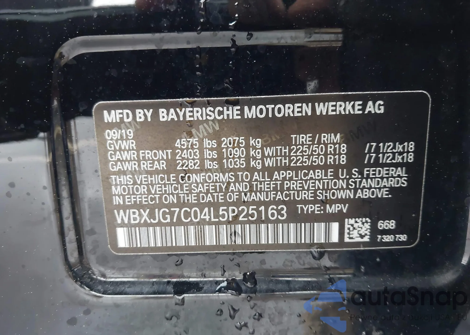 Автомобиль BMW X1 2020 (VIN WBXJG7C04L5P25163) имеет документы, препятствующие регистрации. Могут возникнуть сложности при экспорте и регистрации. Обратитесь к экспертам AutaSnap для поиска альтернатив.