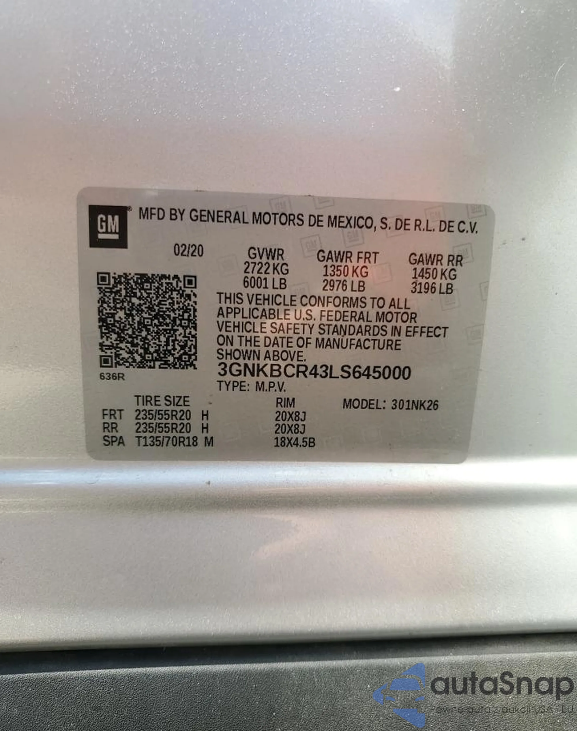 Автомобиль Chevrolet Blazer 2020 (VIN 3GNKBCR43LS645000) имеет документы, препятствующие регистрации. Могут возникнуть сложности при экспорте и регистрации. Обратитесь к экспертам AutaSnap для поиска альтернатив.