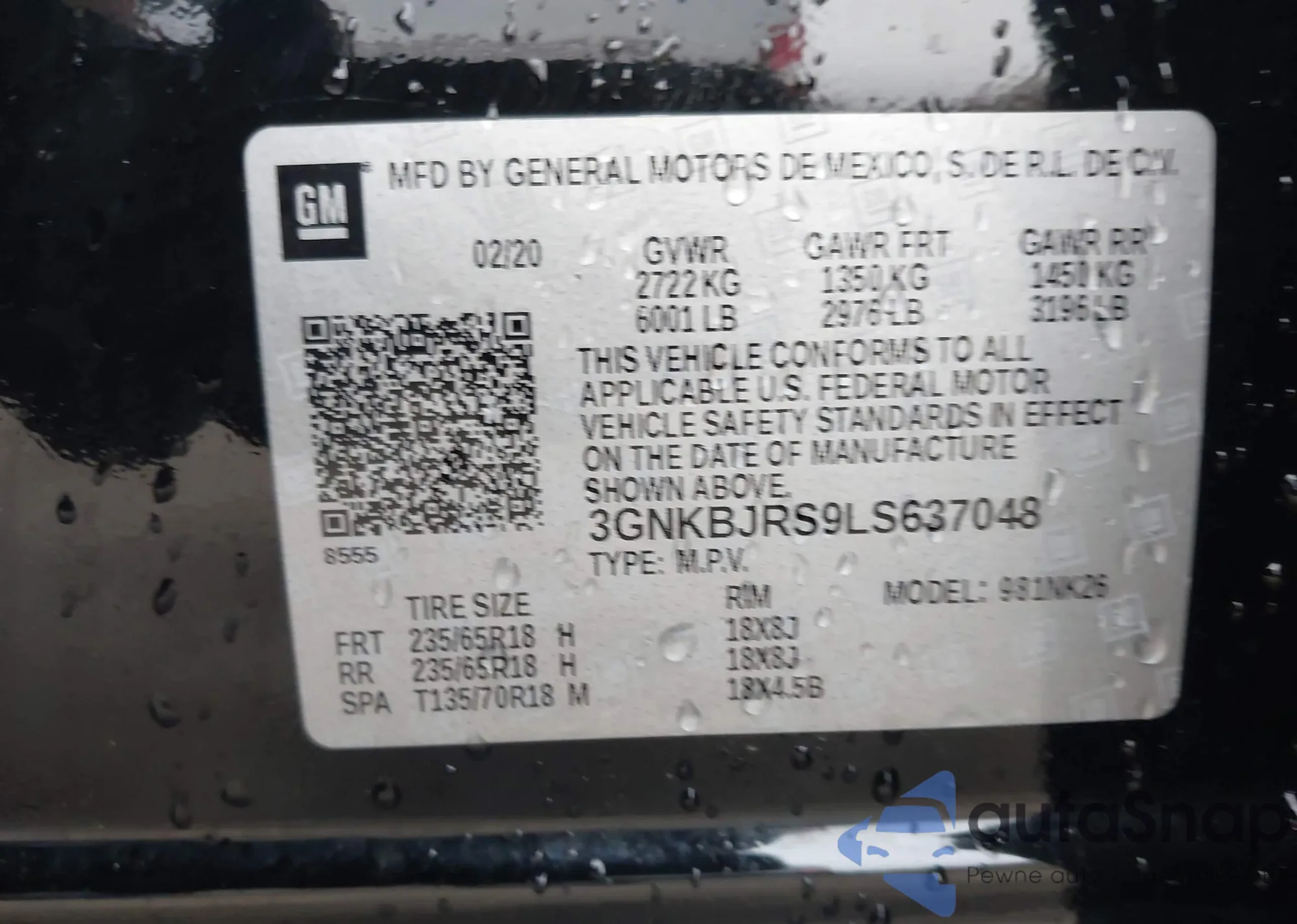 • VIN: 3GNKBJRS9LS637048