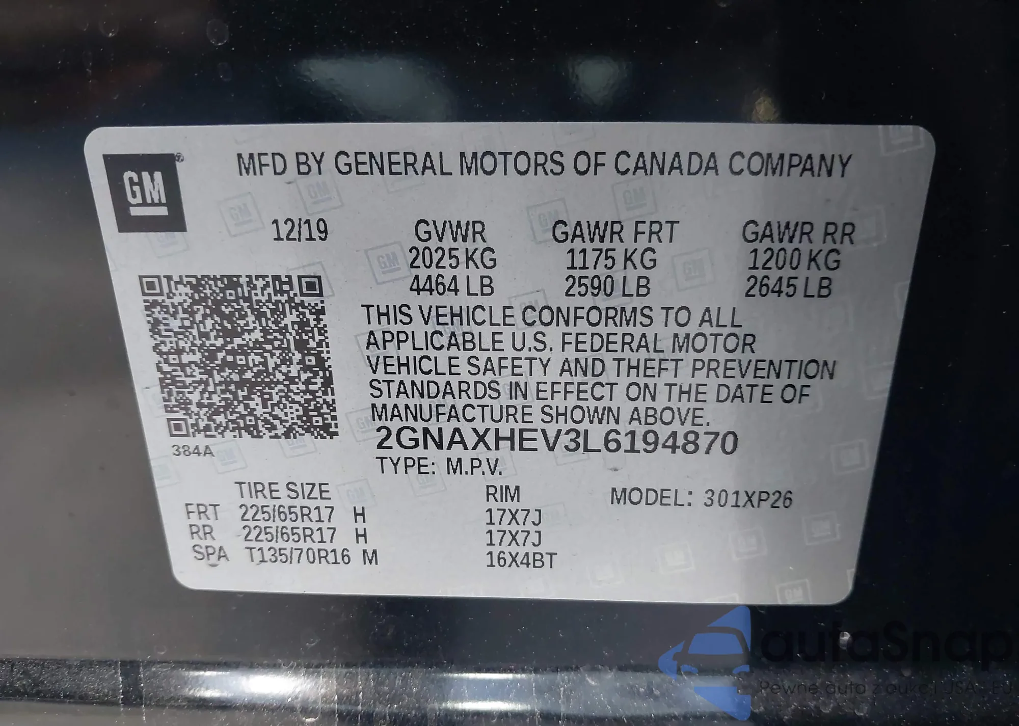 • VIN: 2GNAXHEV3L6194870