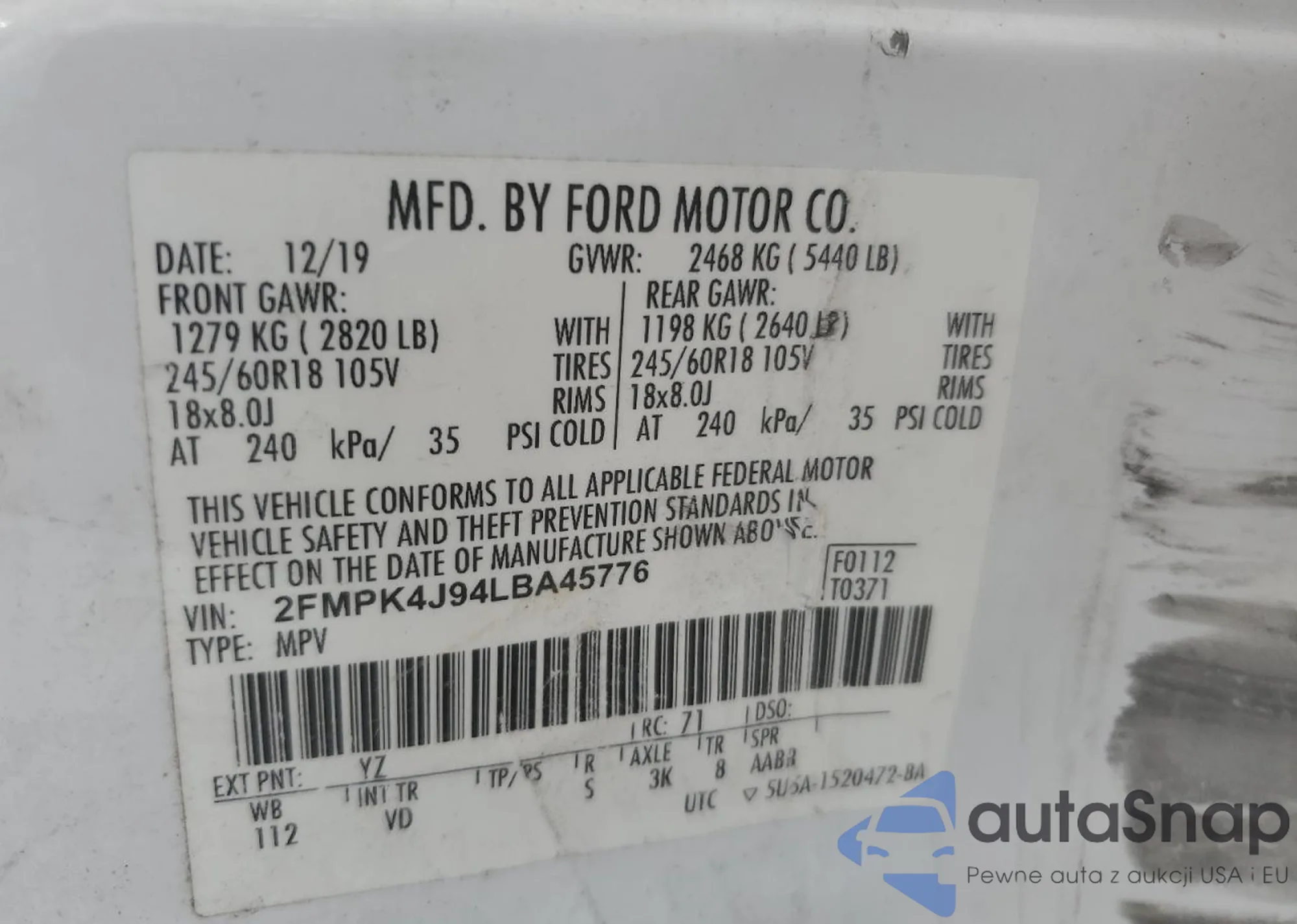 VIN: 2FMPK4J94LBA45776