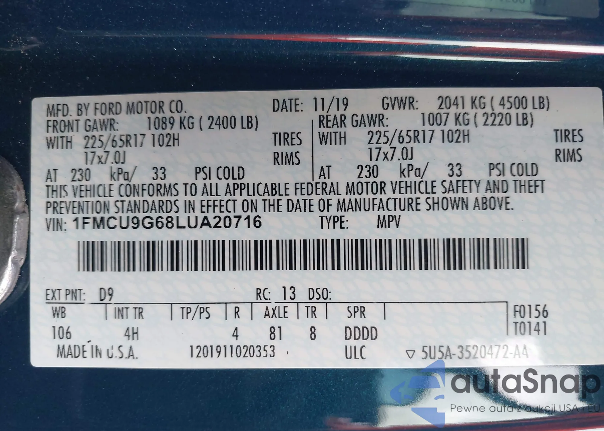VIN: 1FMCU9G68LUA20716