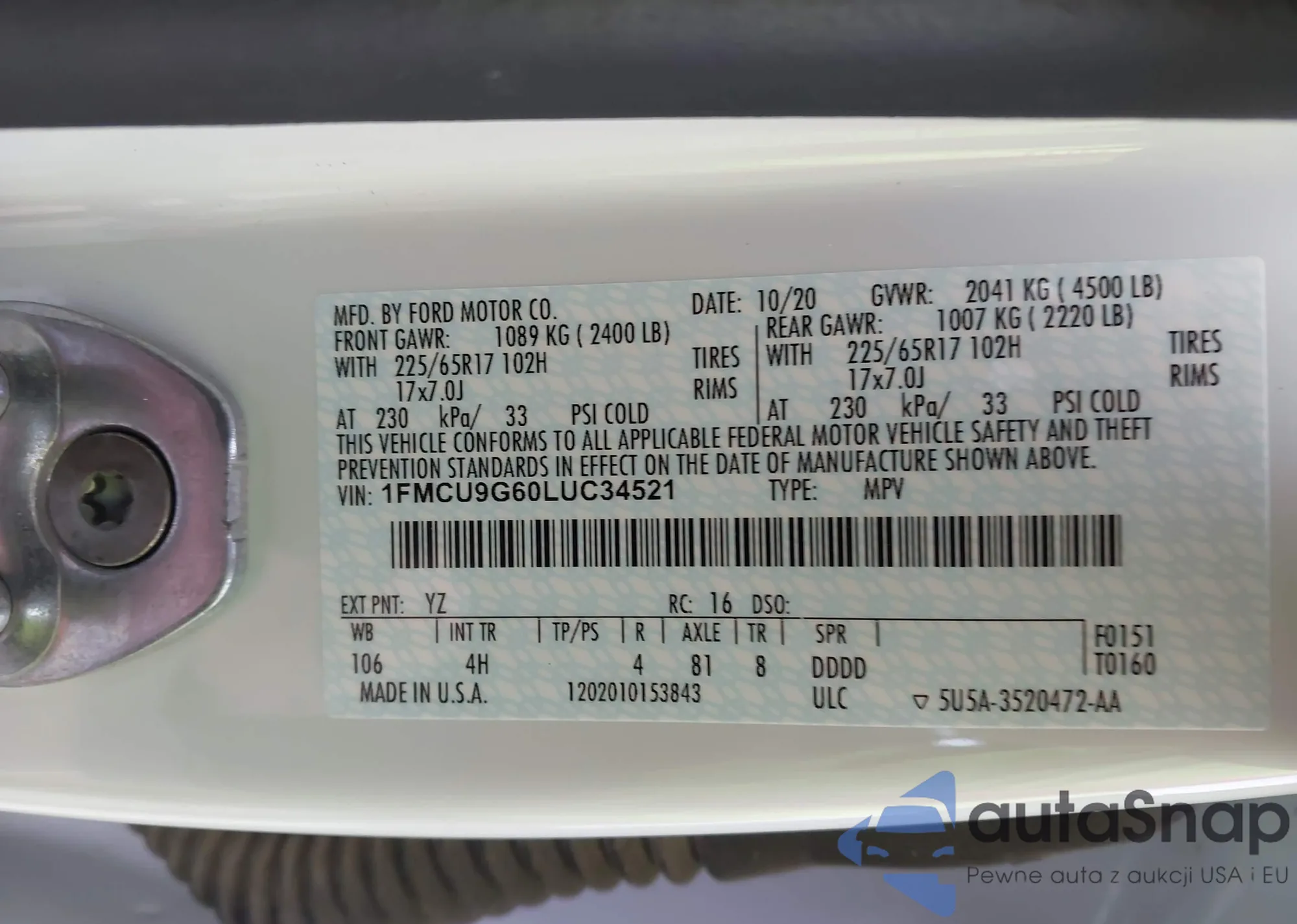 Автомобиль Ford Escape 2020 (VIN 1FMCU9G60LUC34521) ранее не участвовал в торгах. Документы чистые, пробег соответствует или ниже среднего по рынку. Продаётся страховой компанией — рекомендуем покупку. Доставка в порт займет около 6–8 недель.