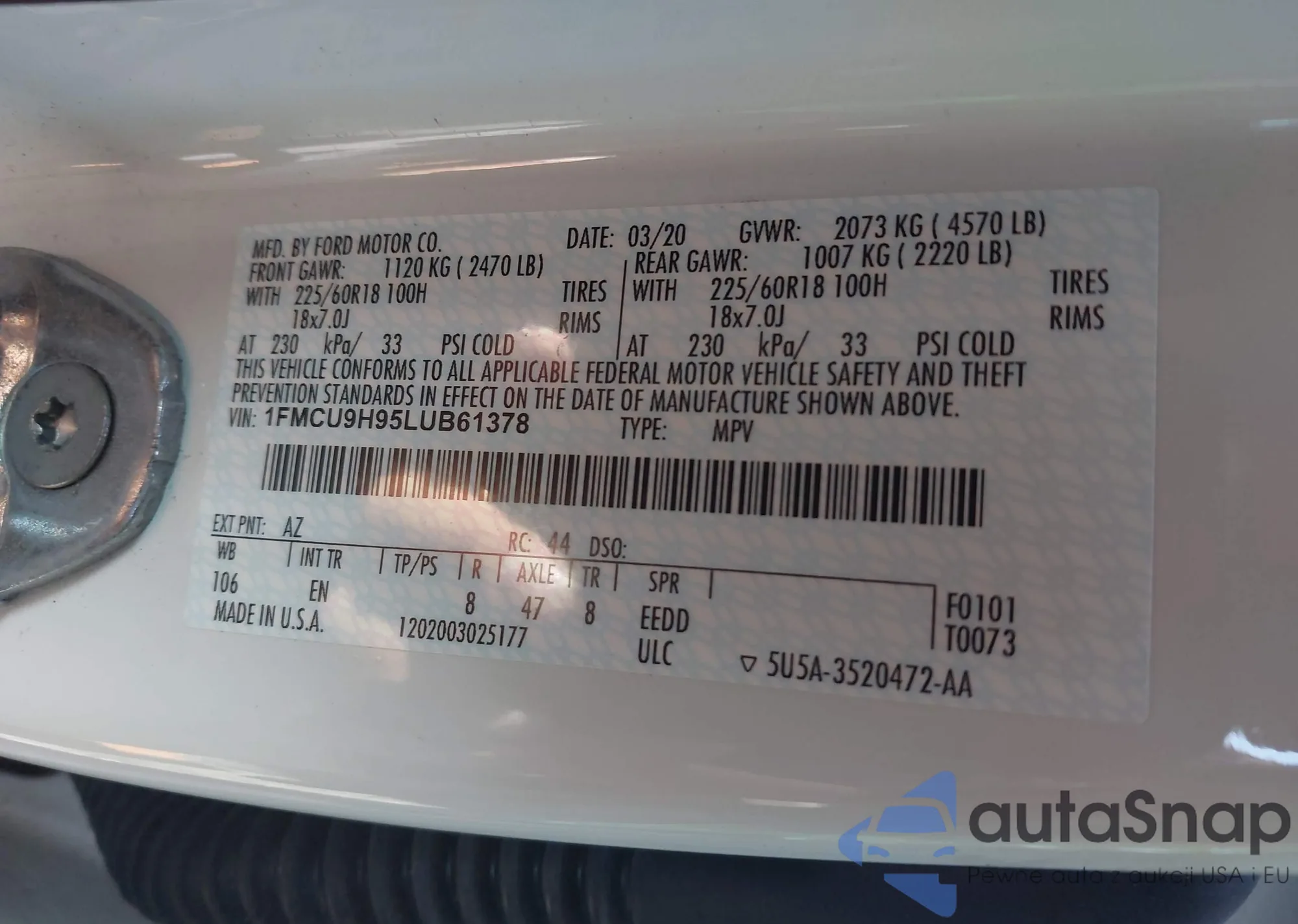 • VIN: 1FMCU9H95LUB61378