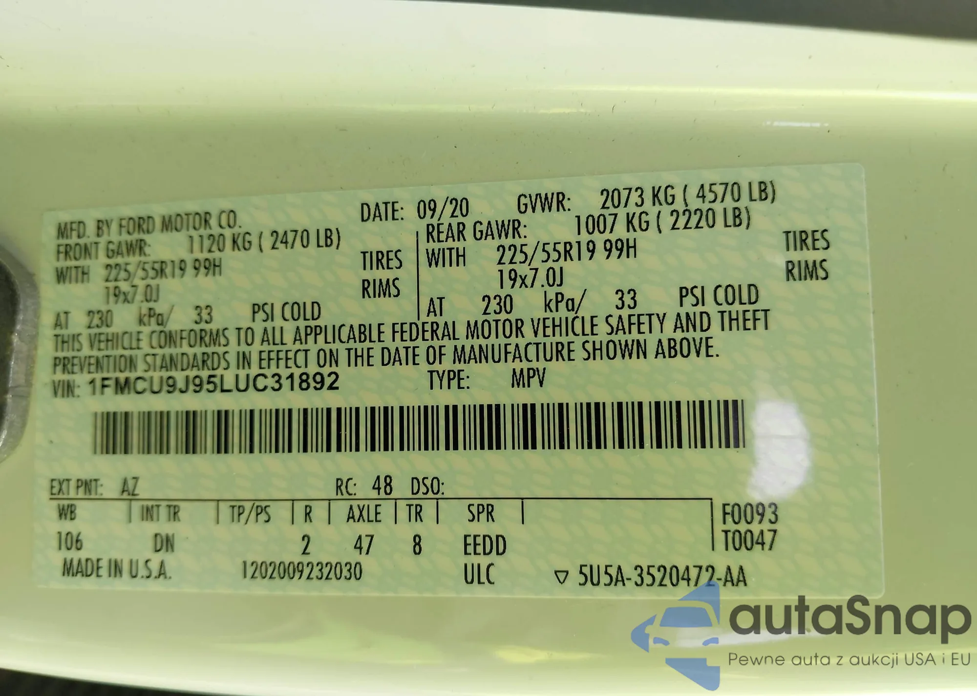VIN: 1FMCU9J95LUC31892