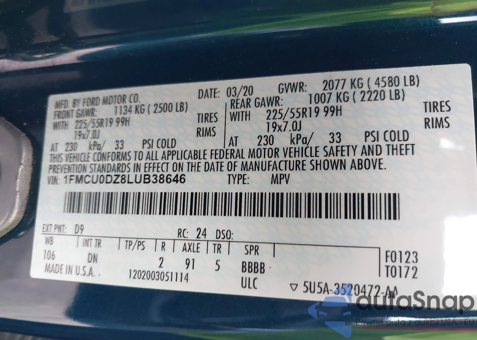 • VIN: 1FMCU0DZ8LUB38646