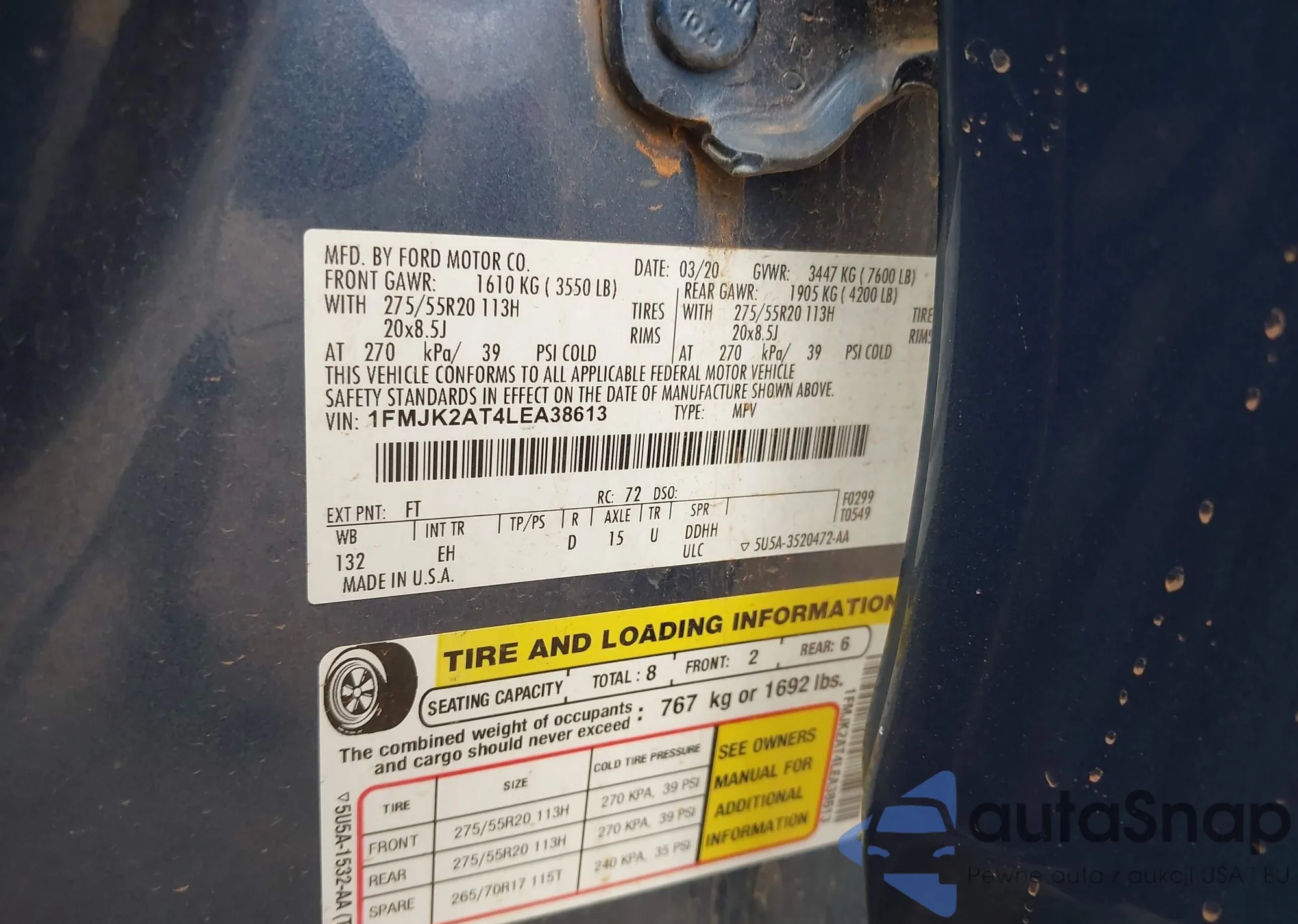 Автомобиль Ford Expedition 2020 (VIN 1FMJK2AT4LEA38613) ранее не участвовал в торгах. Документы чистые, пробег соответствует или ниже среднего по рынку. Продаётся страховой компанией — рекомендуем покупку. Доставка в порт займет около 6–8 недель.
