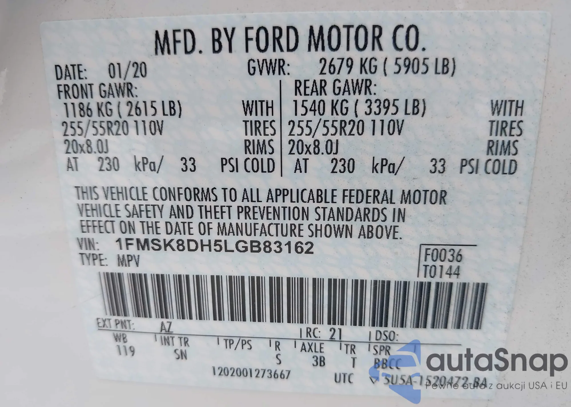 VIN: 1FMSK8DH5LGB83162