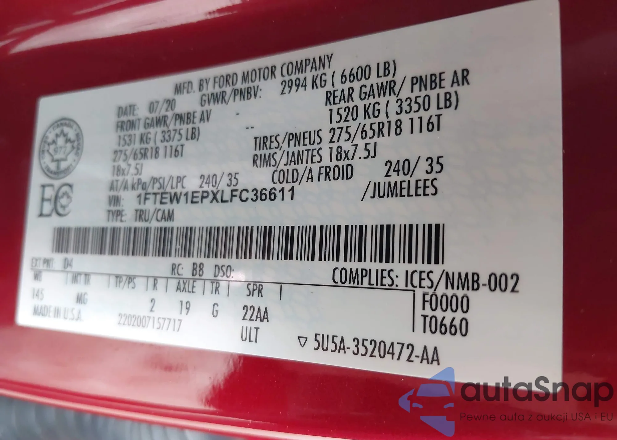 Автомобиль Ford F-150 2020 (VIN 1FTEW1EPXLFC36611) имеет документы, препятствующие регистрации. Могут возникнуть сложности при экспорте и регистрации. Обратитесь к экспертам AutaSnap для поиска альтернатив.