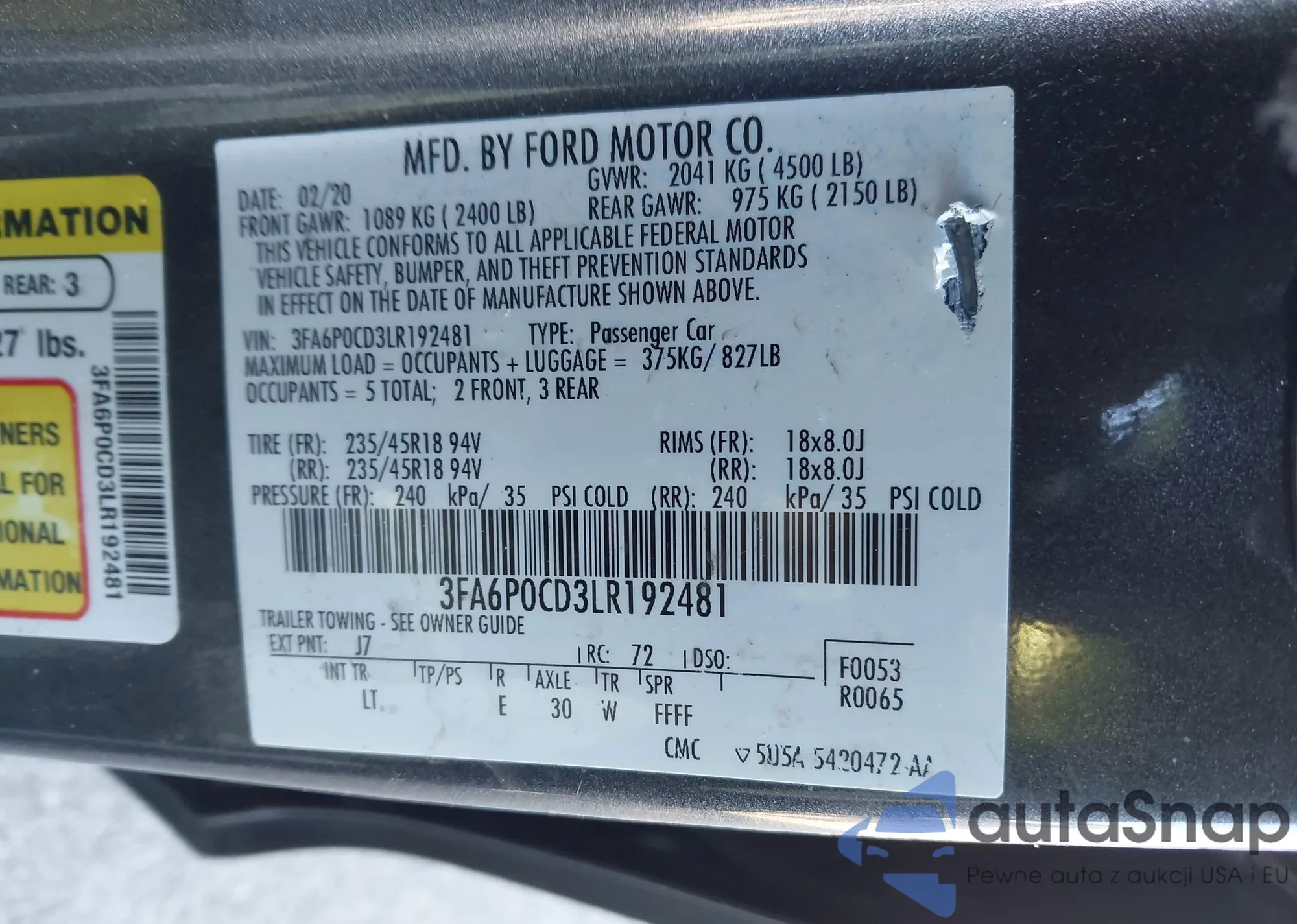 Автомобиль Ford Fusion 2020 (VIN 3FA6P0CD3LR192481) ранее не участвовал в торгах. Документы чистые, пробег соответствует или ниже среднего по рынку. Продаётся страховой компанией — рекомендуем покупку. Доставка в порт займет около 6–8 недель.