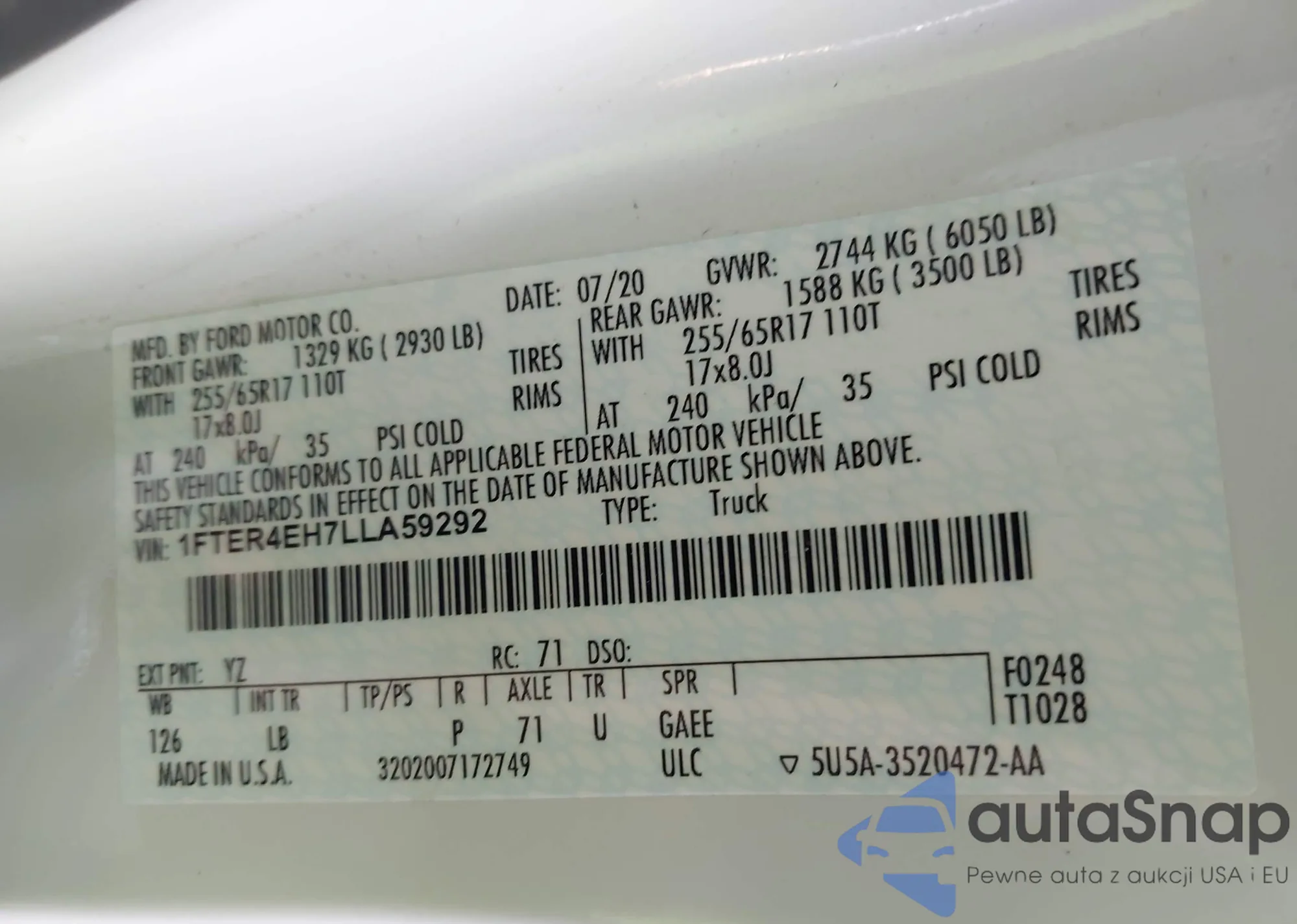 Автомобиль Ford Ranger 2020 (VIN 1FTER4EH7LLA59292) ранее не участвовал в торгах. Документы чистые, пробег соответствует или ниже среднего по рынку. Продаётся страховой компанией — рекомендуем покупку. Доставка в порт займет около 6–8 недель.