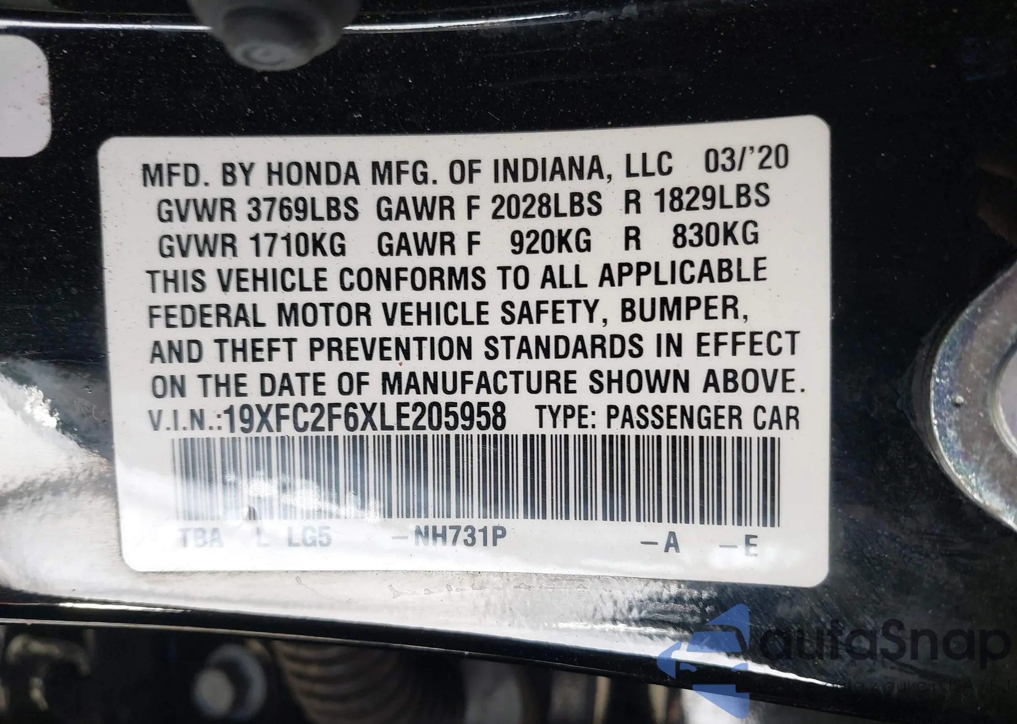• VIN: 19XFC2F6XLE205958