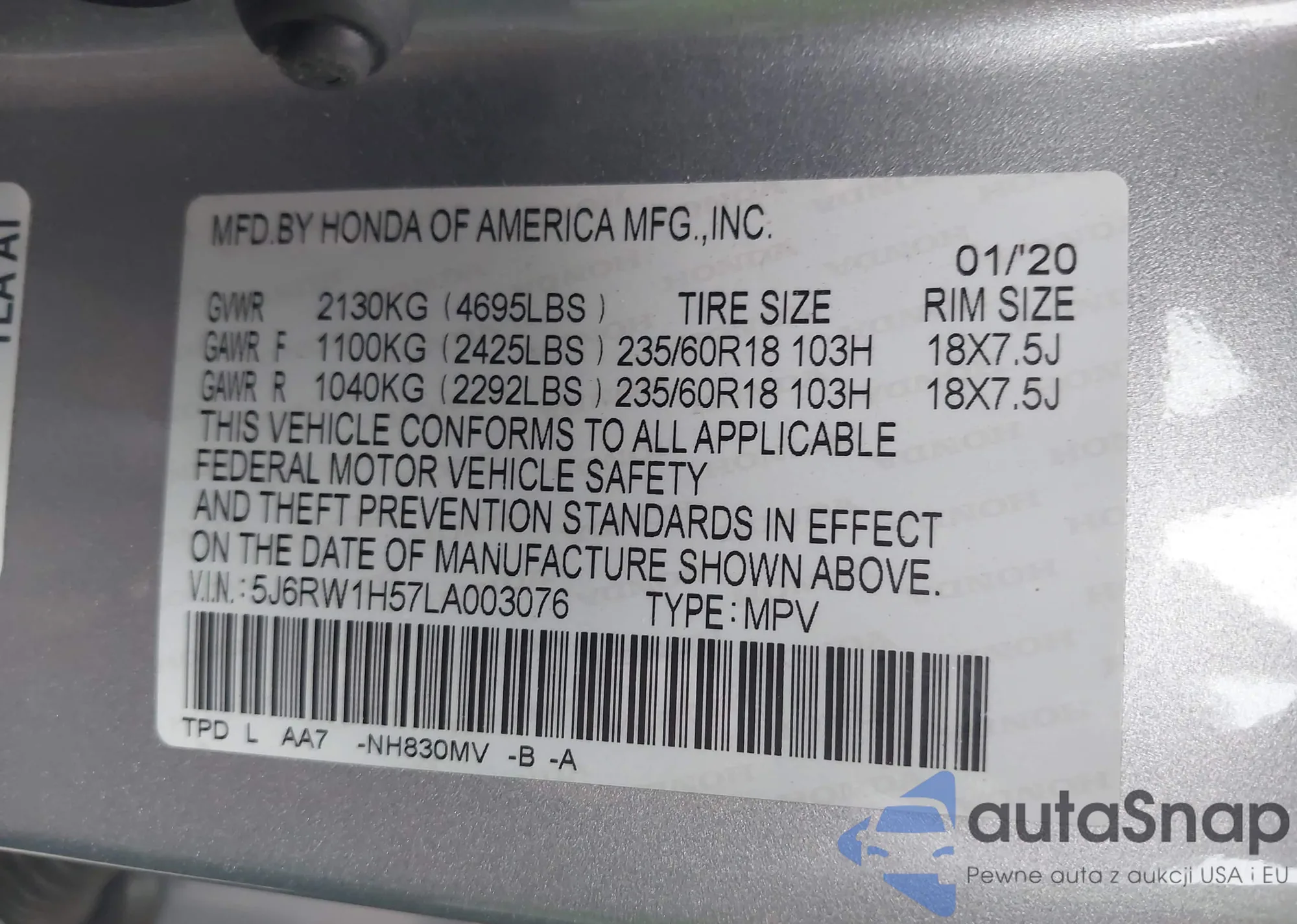 VIN: 5J6RW1H57LA003076