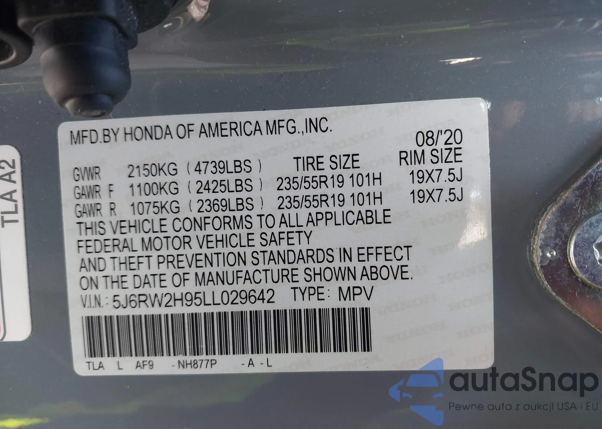 VIN: 5J6RW2H95LL029642
