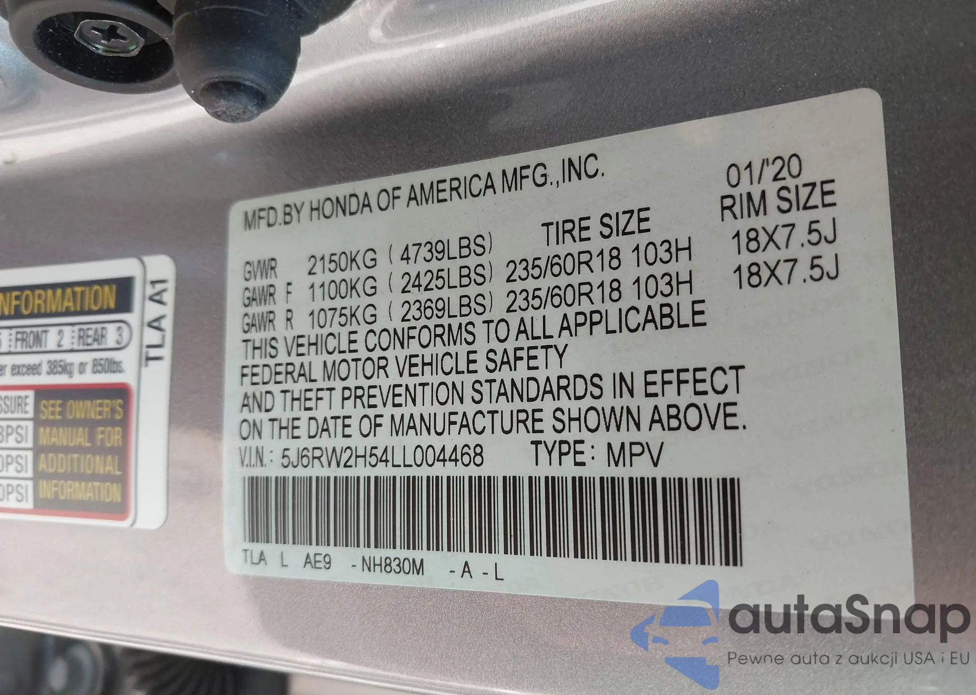• VIN: 5J6RW2H54LL004468