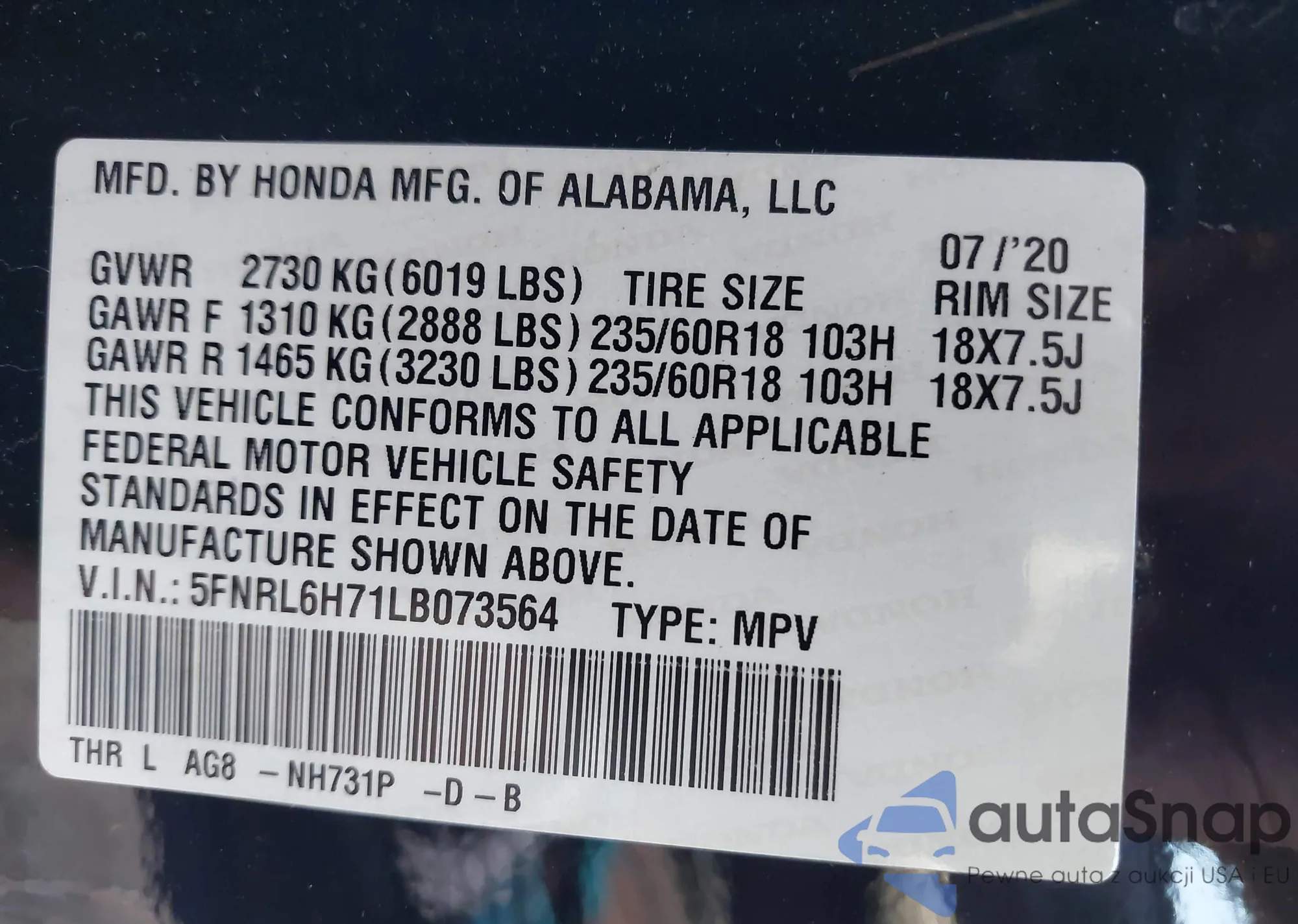VIN: 5FNRL6H71LB073564