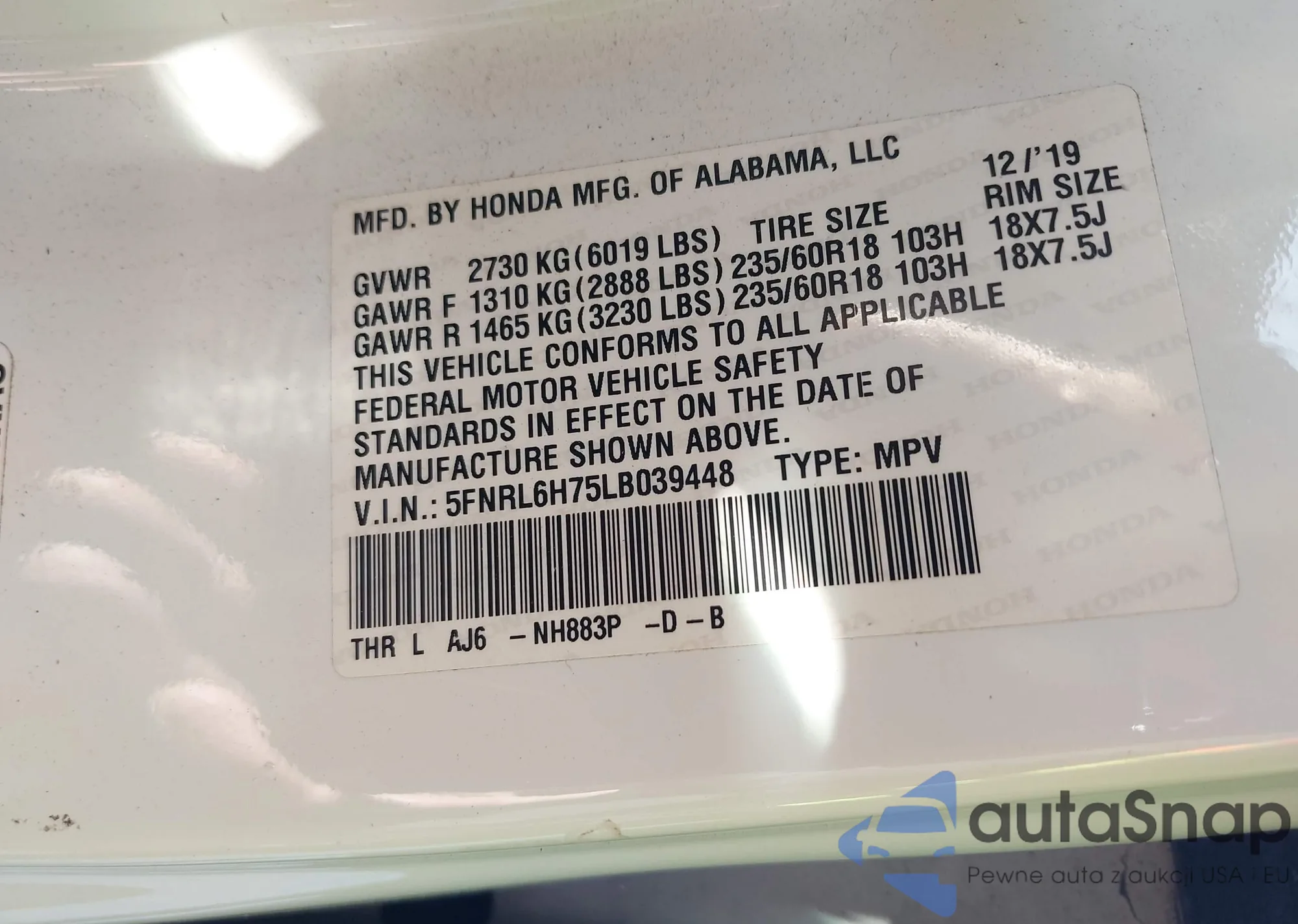 Автомобиль Honda Odyssey 2020 (VIN 5FNRL6H75LB039448) имеет документы, препятствующие регистрации. Могут возникнуть сложности при экспорте и регистрации. Обратитесь к экспертам AutaSnap для поиска альтернатив.