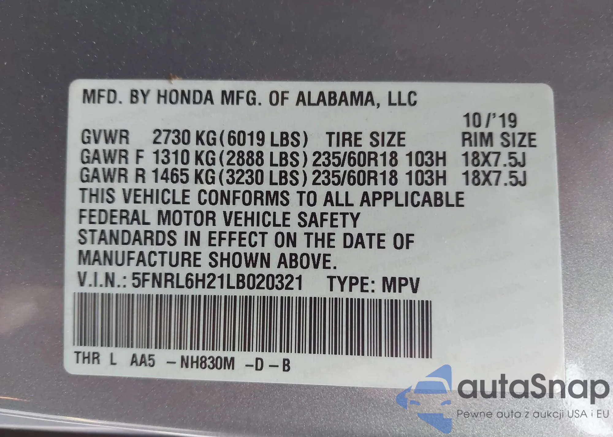 VIN: 5FNRL6H21LB020321