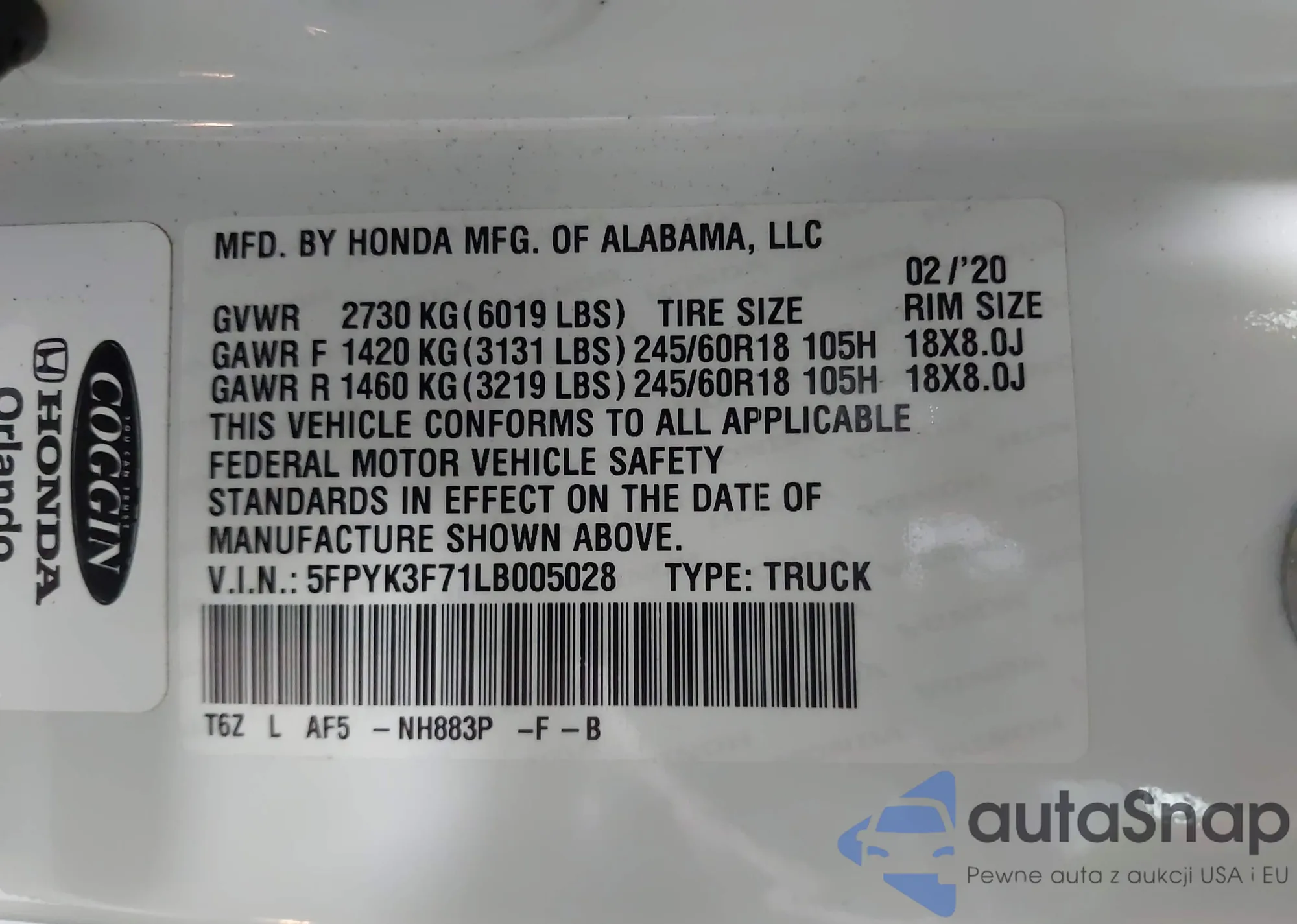 VIN: 5FPYK3F71LB005028