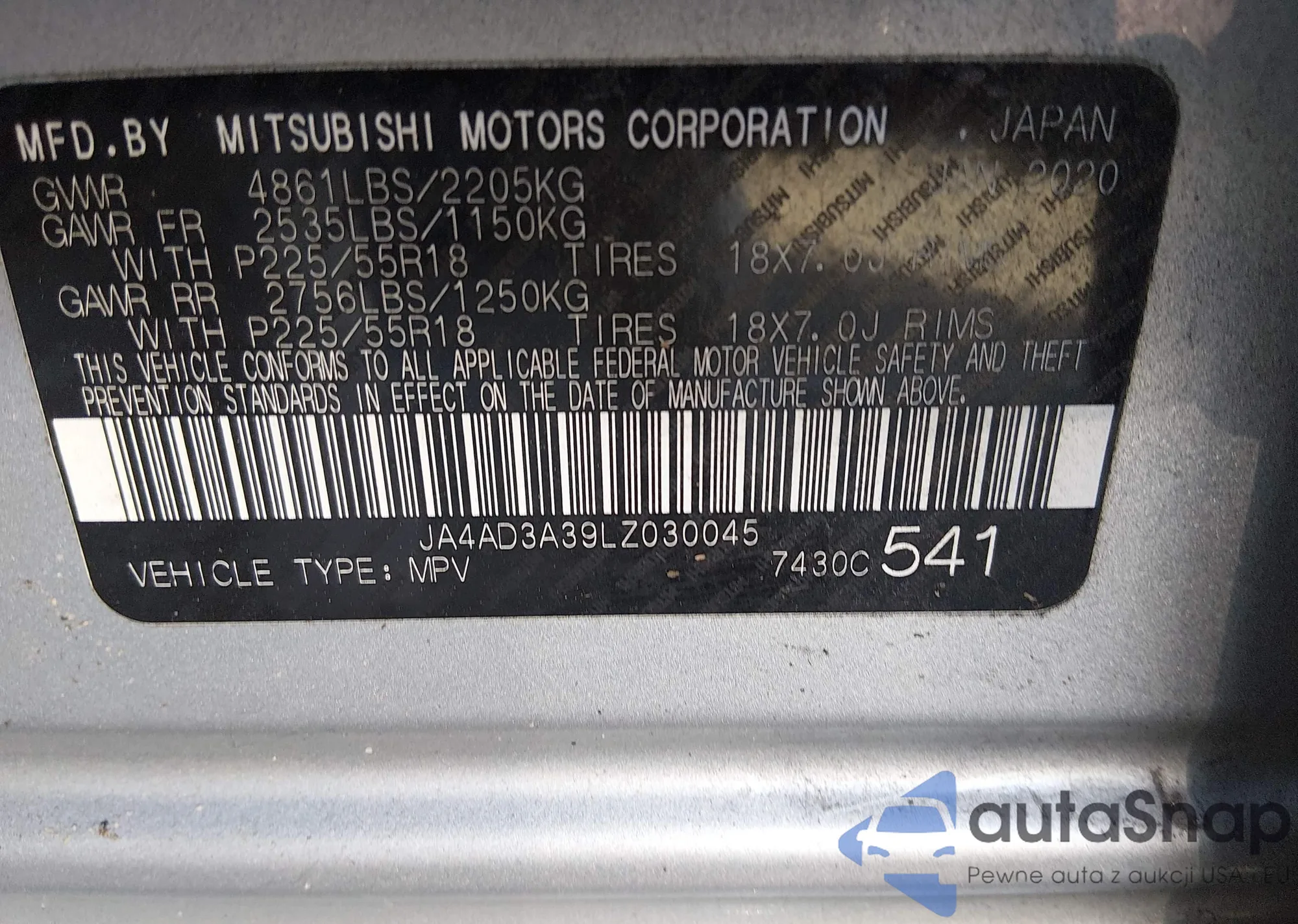 Автомобиль Mitsubishi Outlander 2020 (VIN JA4AD3A39LZ030045) ранее не участвовал в торгах. Документы чистые, пробег соответствует или ниже среднего по рынку. Продаётся страховой компанией — рекомендуем покупку. Доставка в порт займет около 6–8 недель.