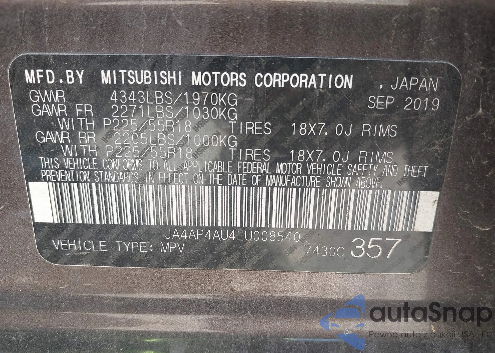 Автомобиль Mitsubishi Outlander 2020 (VIN JA4AP4AU4LU008540) имеет документы, препятствующие регистрации. Могут возникнуть сложности при экспорте и регистрации. Обратитесь к экспертам AutaSnap для поиска альтернатив.