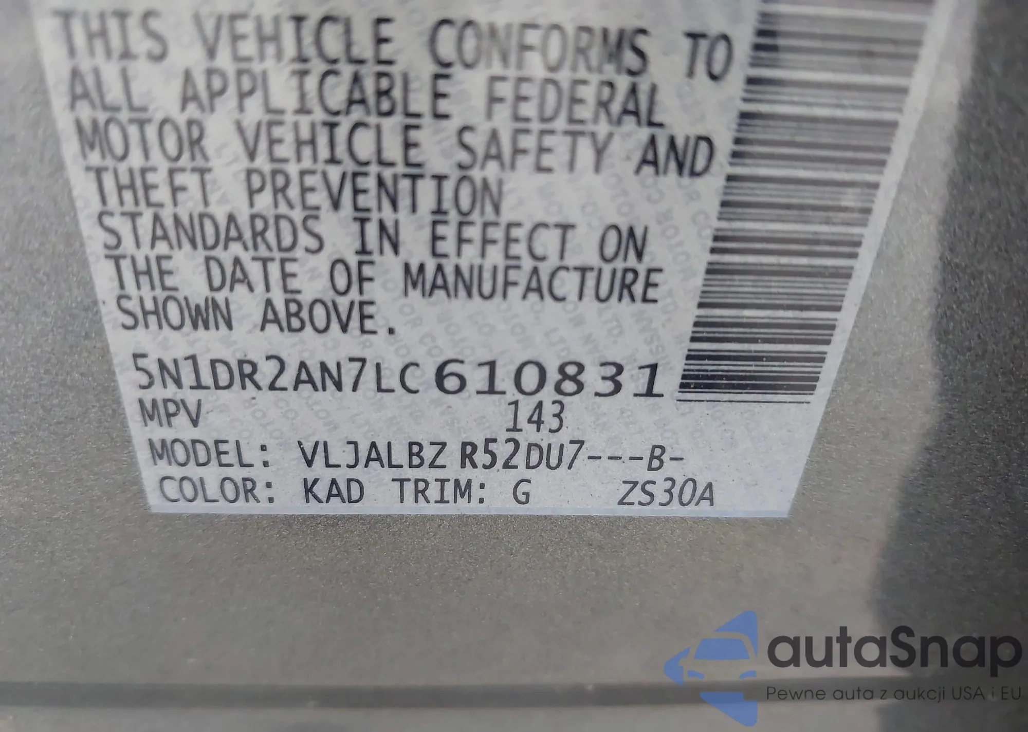 • VIN: 5N1DR2AN7LC610831
