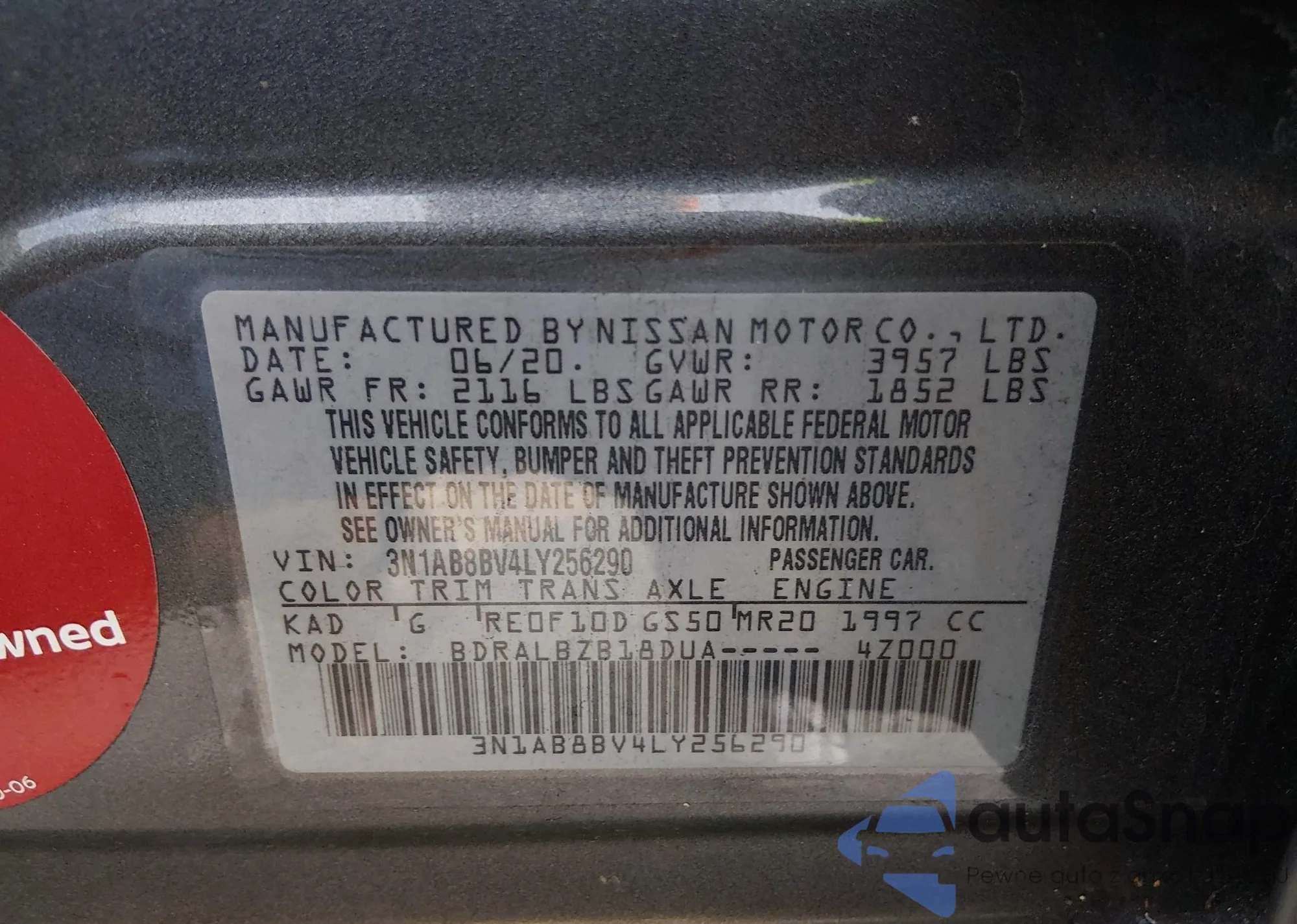 Автомобиль Nissan Sentra 2020 (VIN 3N1AB8BV4LY256290) имеет документы, препятствующие регистрации. Могут возникнуть сложности при экспорте и регистрации. Обратитесь к экспертам AutaSnap для поиска альтернатив.