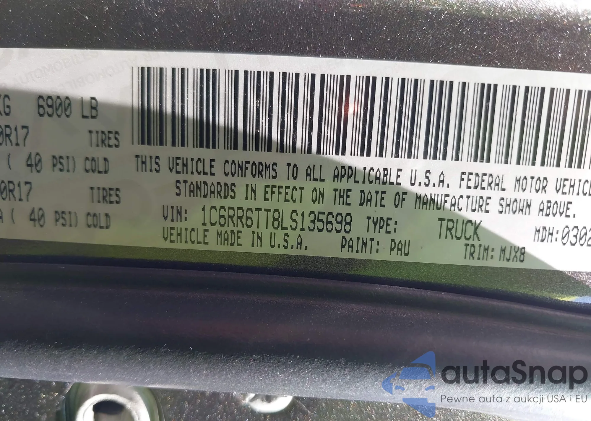 Автомобиль RAM 1500 2020 (VIN 1C6RR6TT8LS135698) ранее не участвовал в торгах. Документы чистые, пробег соответствует или ниже среднего по рынку. Продаётся страховой компанией — рекомендуем покупку. Доставка в порт займет около 6–8 недель.