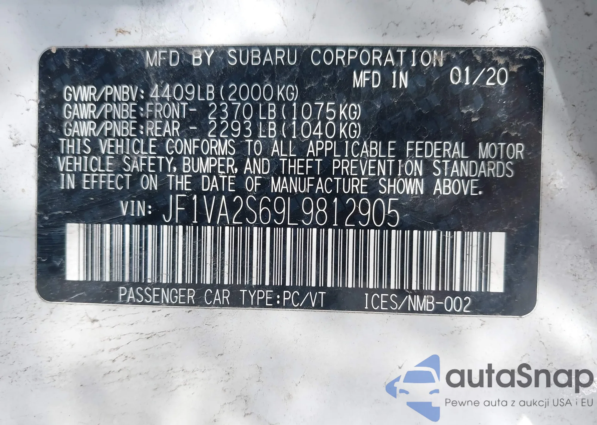 Автомобиль Subaru WRX STi 2020 (VIN JF1VA2S69L9812905) ранее не участвовал в торгах. Документы чистые, пробег соответствует или ниже среднего по рынку. Продаётся страховой компанией — рекомендуем покупку. Доставка в порт займет около 6–8 недель.